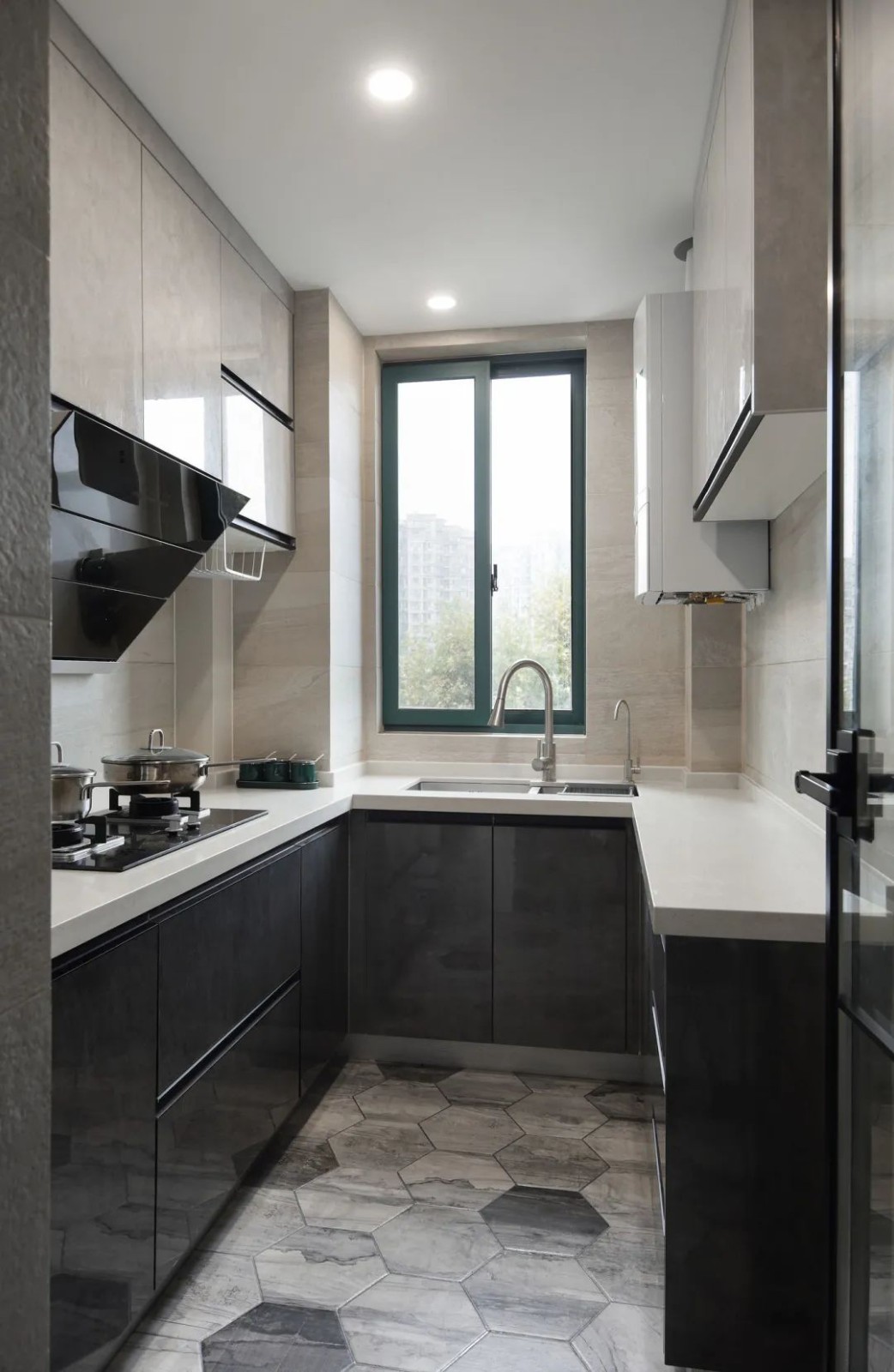厨房空间很小,但还是打造了U字型的橱柜布局,提供了充足的收纳+操作空间。