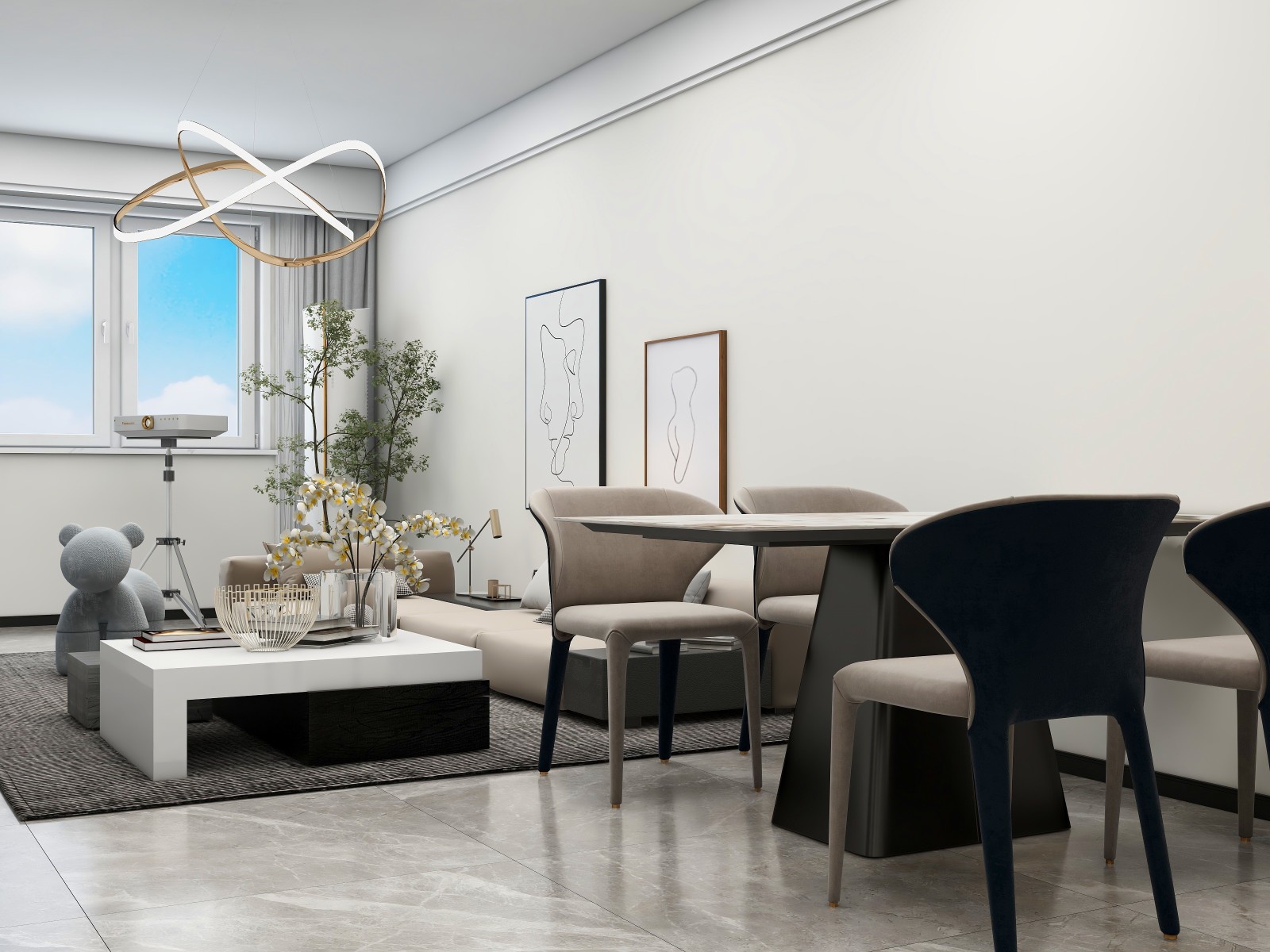 简单的极简沙发,搭配岩板餐桌,质感强烈
