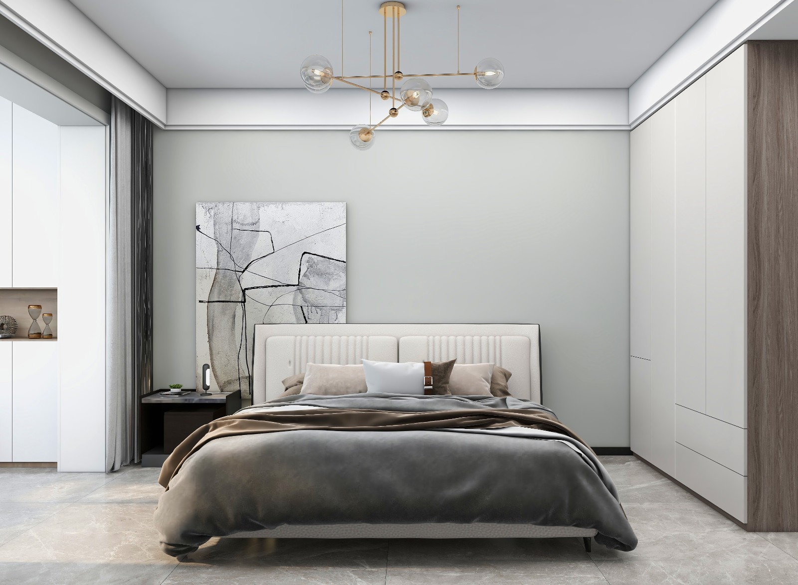 新灰色大面墙体乳胶漆搭配太空漫步床头墙,卧室就显得格外温馨