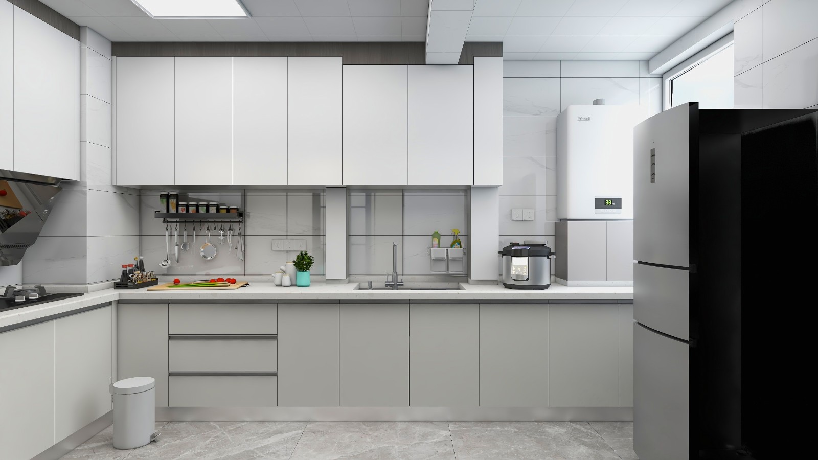 一体化厨房设计,台下盆工艺更好打理,竖着的燃气管包括下水管用柜体板包覆起来,空间更整洁