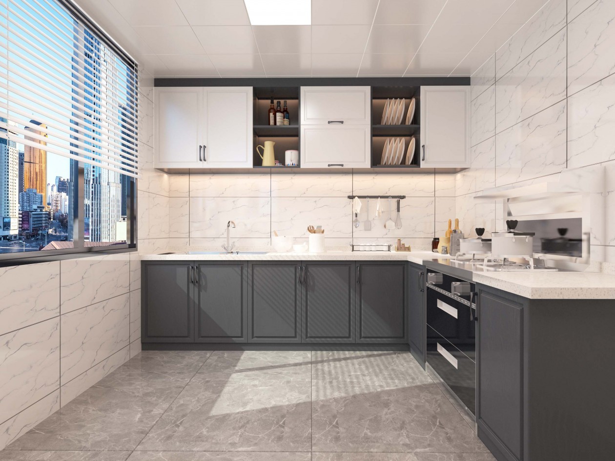 地柜深色系,吊柜浅色,厨房集成灶
