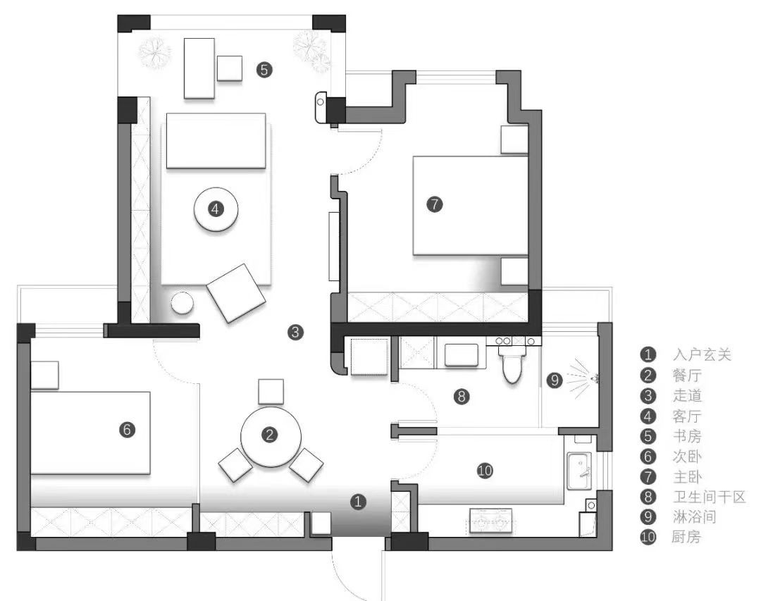 本案为89㎡的三居室素雅的软装、围合式布局,让生活在这里慢下来。