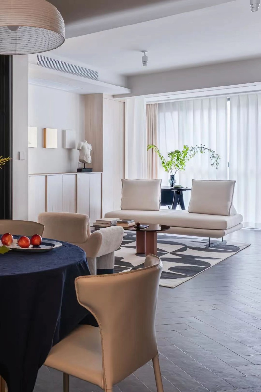 客厅减少了吊顶方面的工作,有限的吊顶结构一是为了解决客厅风管机的放置,二是削弱梁体在客餐厅中间进门瞬间直指眼球的不适感。