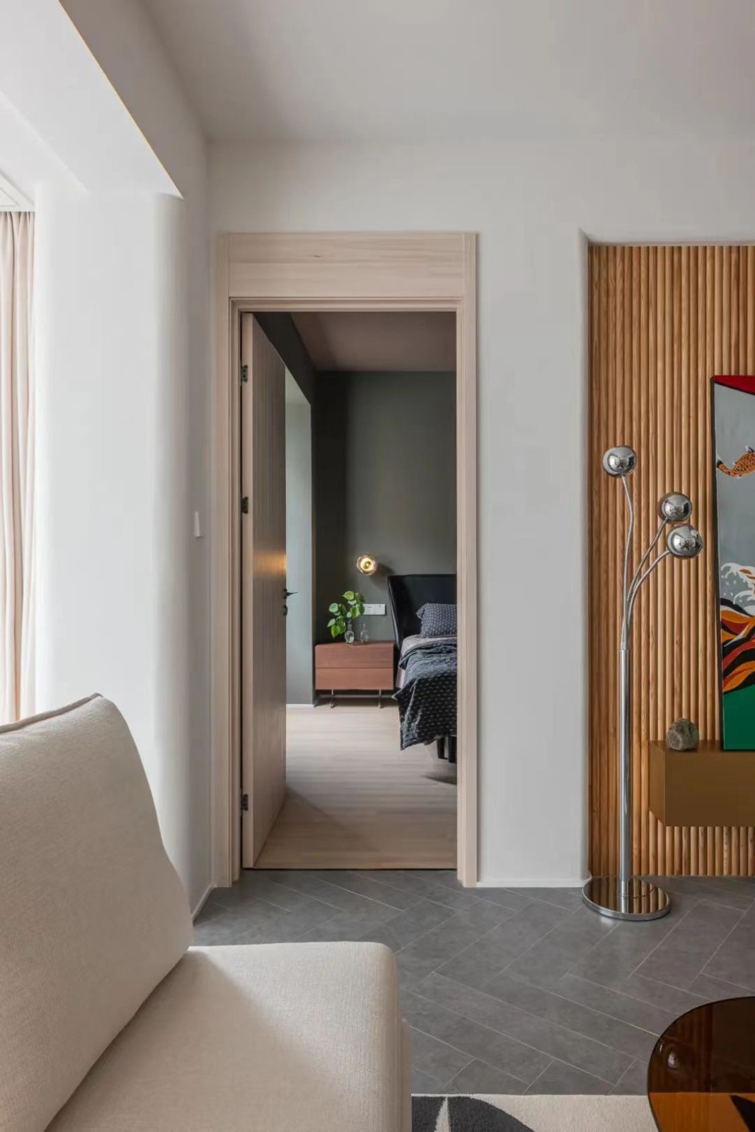 主卧的门被分布在了客厅的另外一边,缩短主卧和客厅距离的同时,扩大了主卧内部的储物容量,又能跟次卧保持更独立的空间感受。