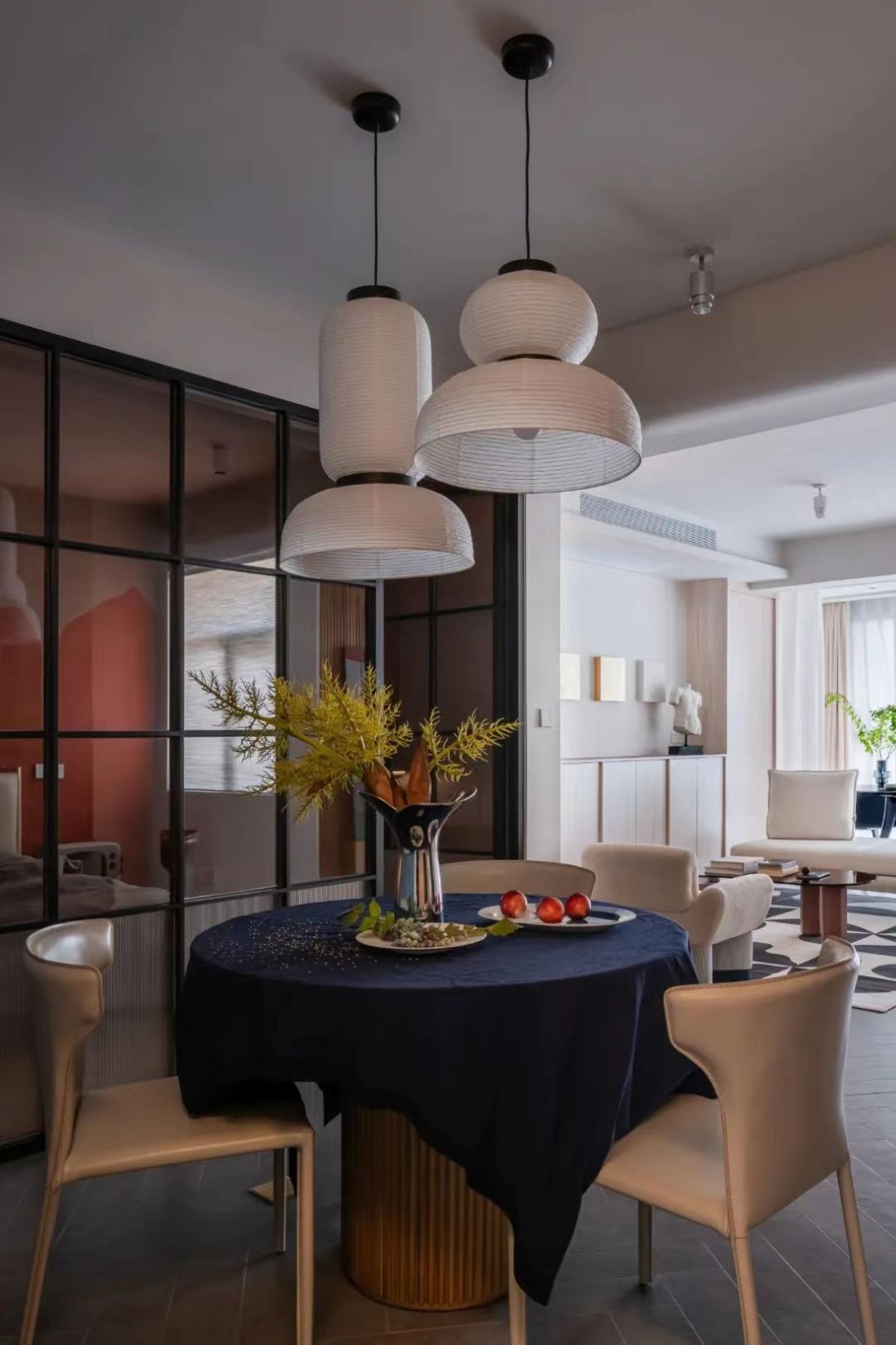 蓝色的餐桌布,米白色的皮革餐椅,一目了然的色彩和精准把控的细节,兼具家具艺术感与实用性,是空间审美个人化的重要组成部分。