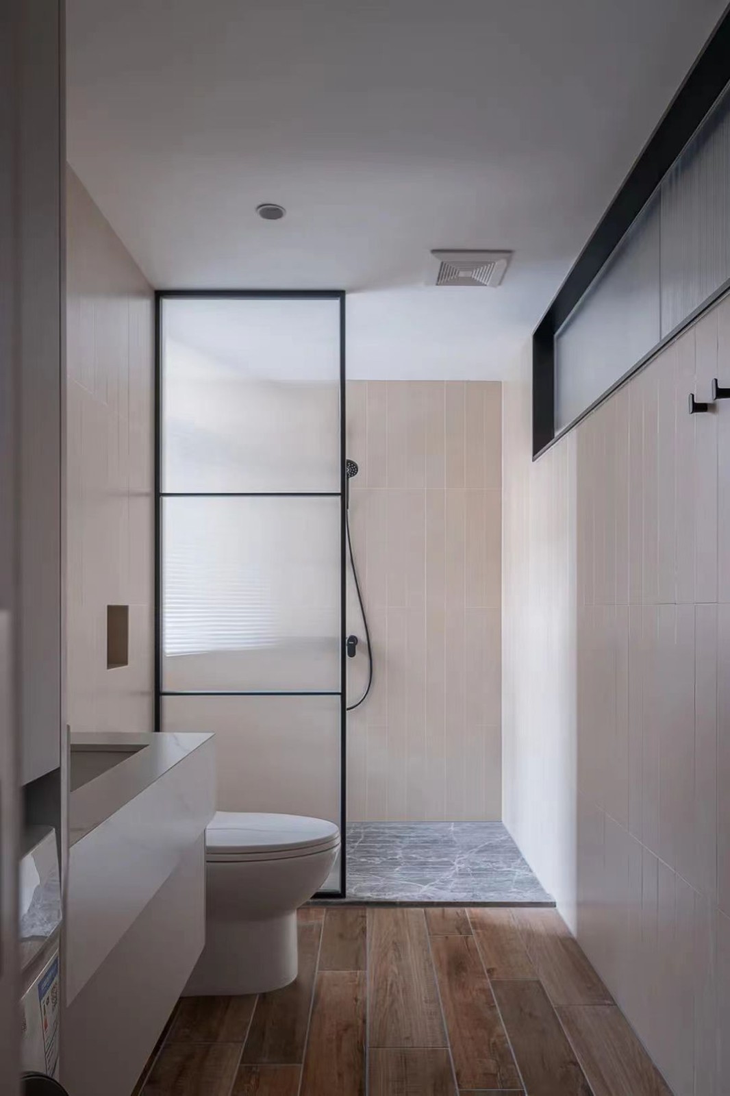 轻松兼规整感是卫生间给我们的***视觉印象,墙砖选用了***米色的条形砖进行铺贴,干区地面采用了不同规格尺度的木纹砖。