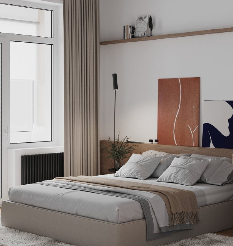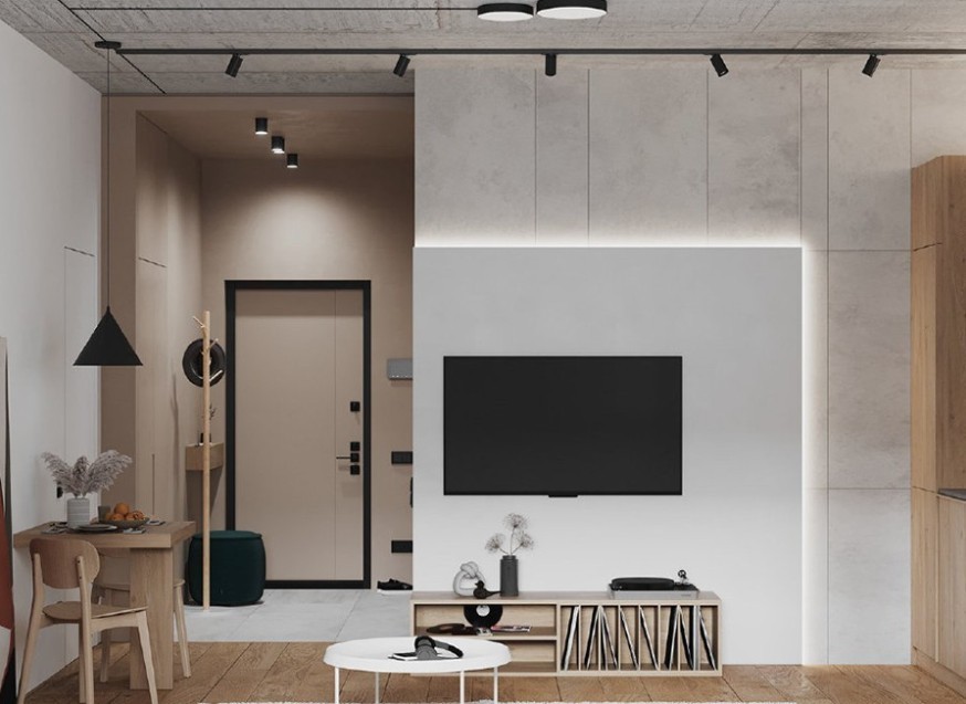 电视背景墙贴合简约两字,白色的背板做了隐藏灯带设计,柔和的光芒软化黑白对比的生硬感。