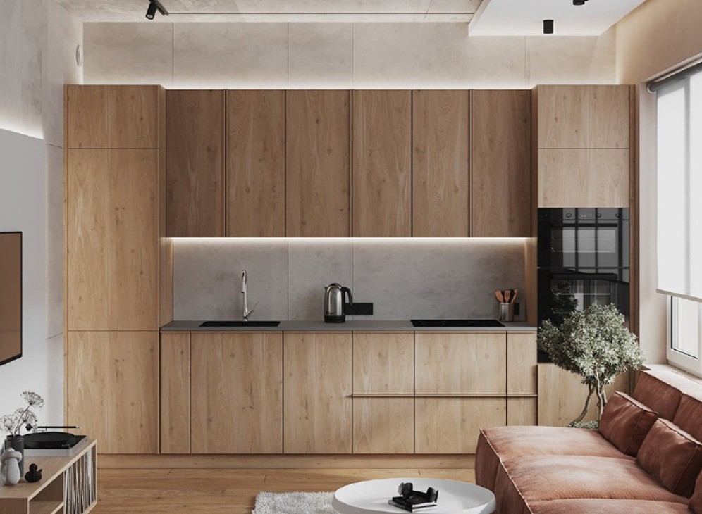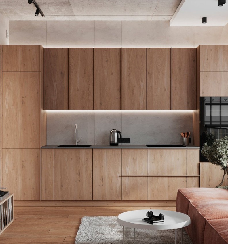 厨房以大面积的原木引领我们的视角;