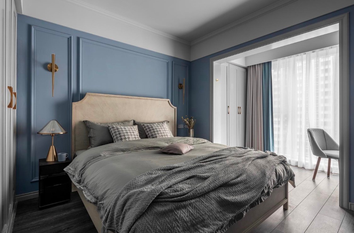 主卧以屋主最爱的蓝色为主色调,辅以白和浅灰色,为屋主打造了一个宁静淡雅的睡眠空间。