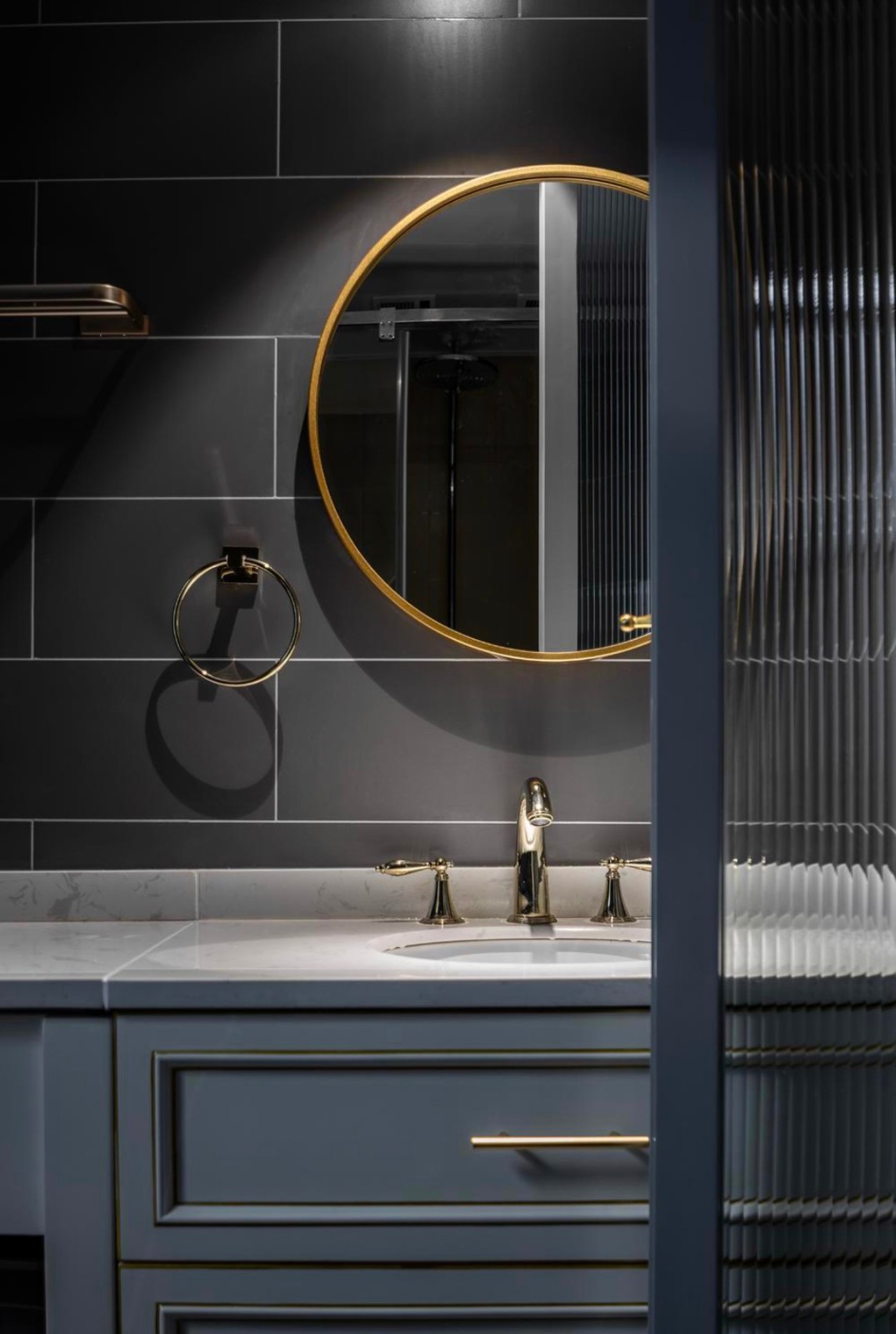 为避免空间色彩太多带来杂乱感,卫生间的整体配色也与卧室的蓝灰色调维持一致,台面选择了鱼肚白人造石,在灰色墙砖和蓝色柜体之间形成鲜明的过度。