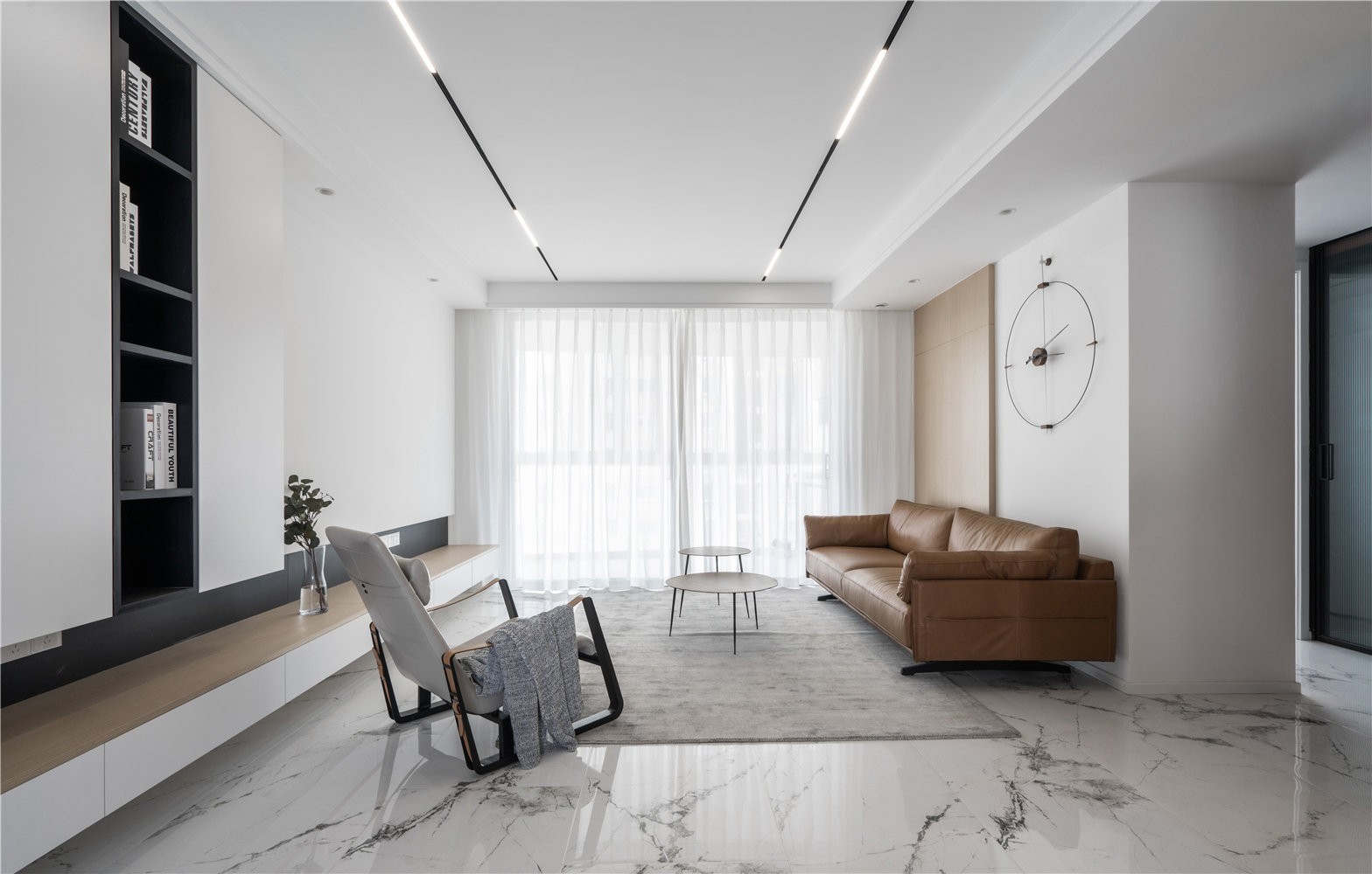 客厅做了无主灯的设计,因为本身楼层较高,而且整个客厅的采光十分充足,所以简单的筒灯加灯带的组合足以满足客厅的照明需求。地面采用了诺贝尔的大地砖通铺,让客厅更加通透。电视墙部分则是基本的乳胶漆,没有安装电视,主要是考虑到家里小朋友怕影响视力。