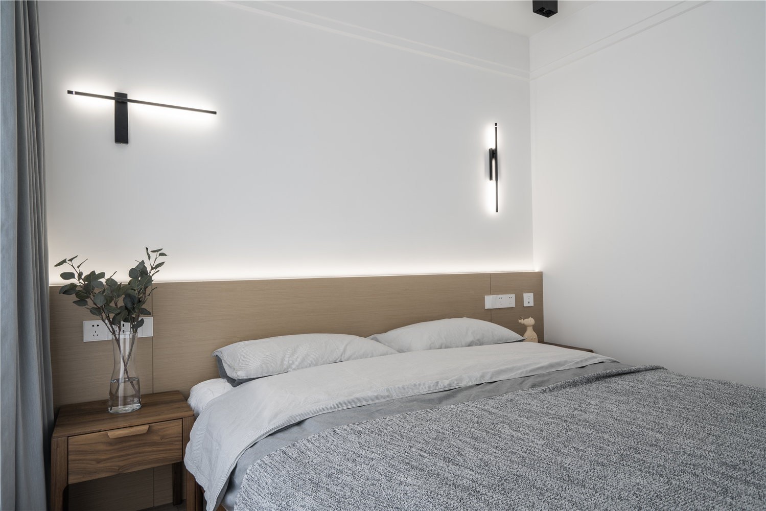 本个案例的主要色彩搭配以黑白灰为主,点缀些许木色,让整个空间多了一些温馨与随性,不至于黑白灰给人一种冷冰冰的体验。这种搭配在主卧尤为明显,既考虑全局的风格协调,又要营造一种卧室温馨、舒适的氛围。