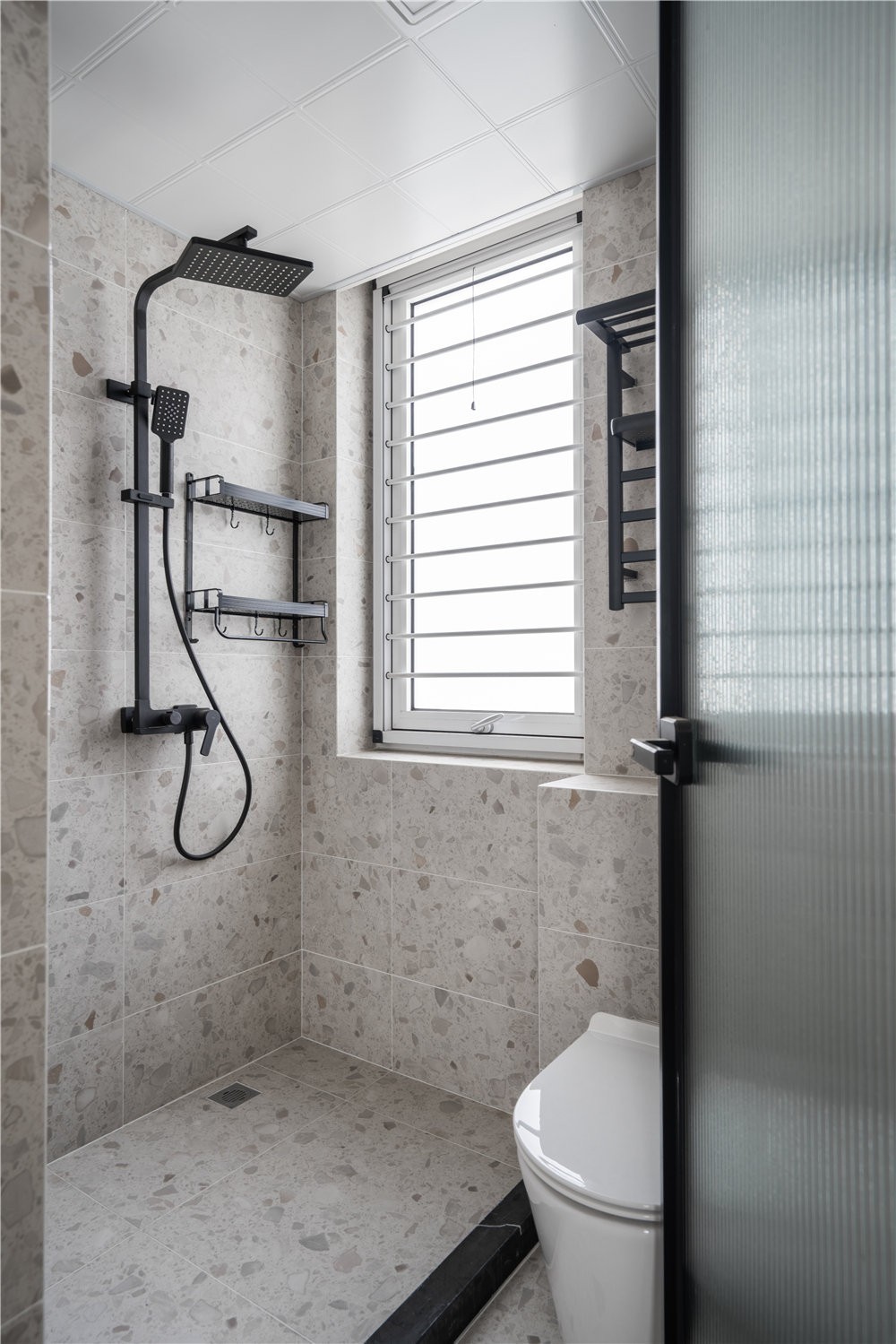 卫生间的空间色彩依旧以黑白灰为主,坐便器考虑智能马桶,玻璃隔断让淋浴区与马桶隔开,方便后期的使用。内有做壁龛,做了置物篮来放日常洗漱用品