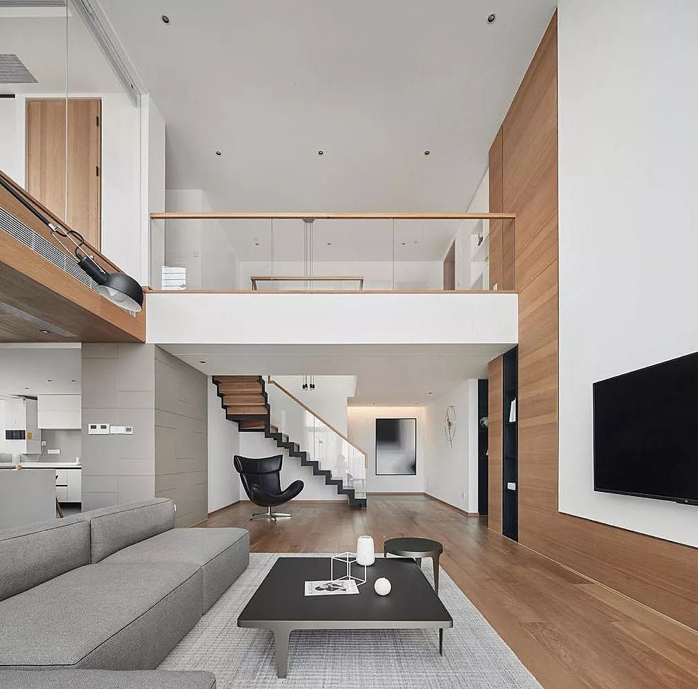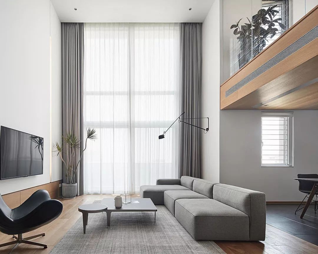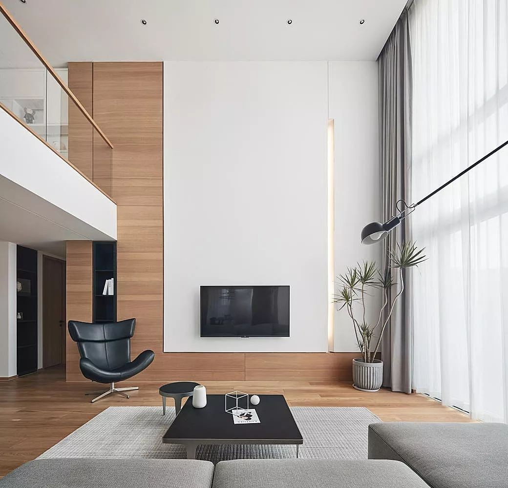 当身处客厅时,5.9米的层高,顿时提升了空间的强大气场,结合空间与光影之间的关系,以人文载体与自然元素来表达,激发了另一种形式的简约现代主义。