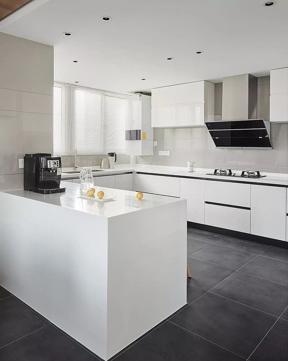 宽敞的厨房选用了亮面烤漆门板为主色调,塑造出简洁清爽的空间效果,定制的橱柜拥有丰富的储物空间,将厨房杂物收纳妥当。