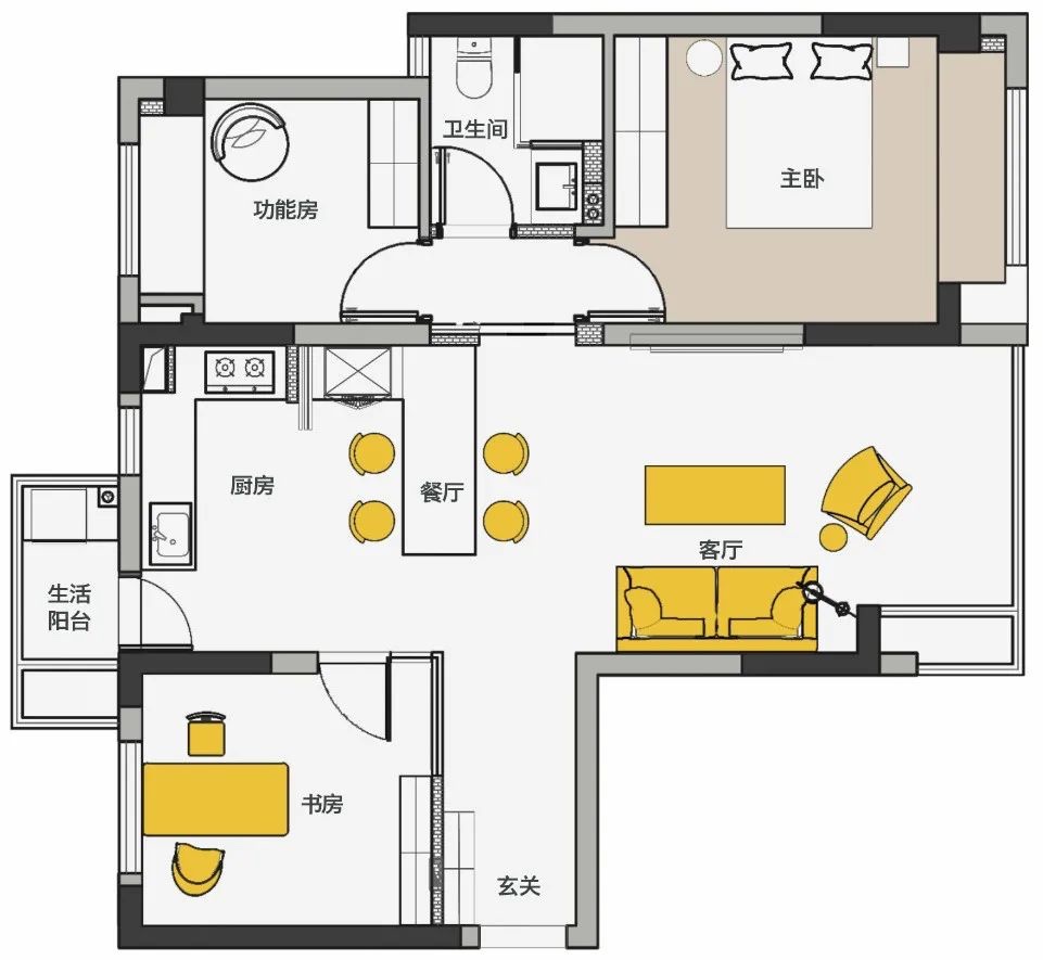 学习站在居住者角度去想象她在空间的生活动线,因此将阳台纳入客厅。