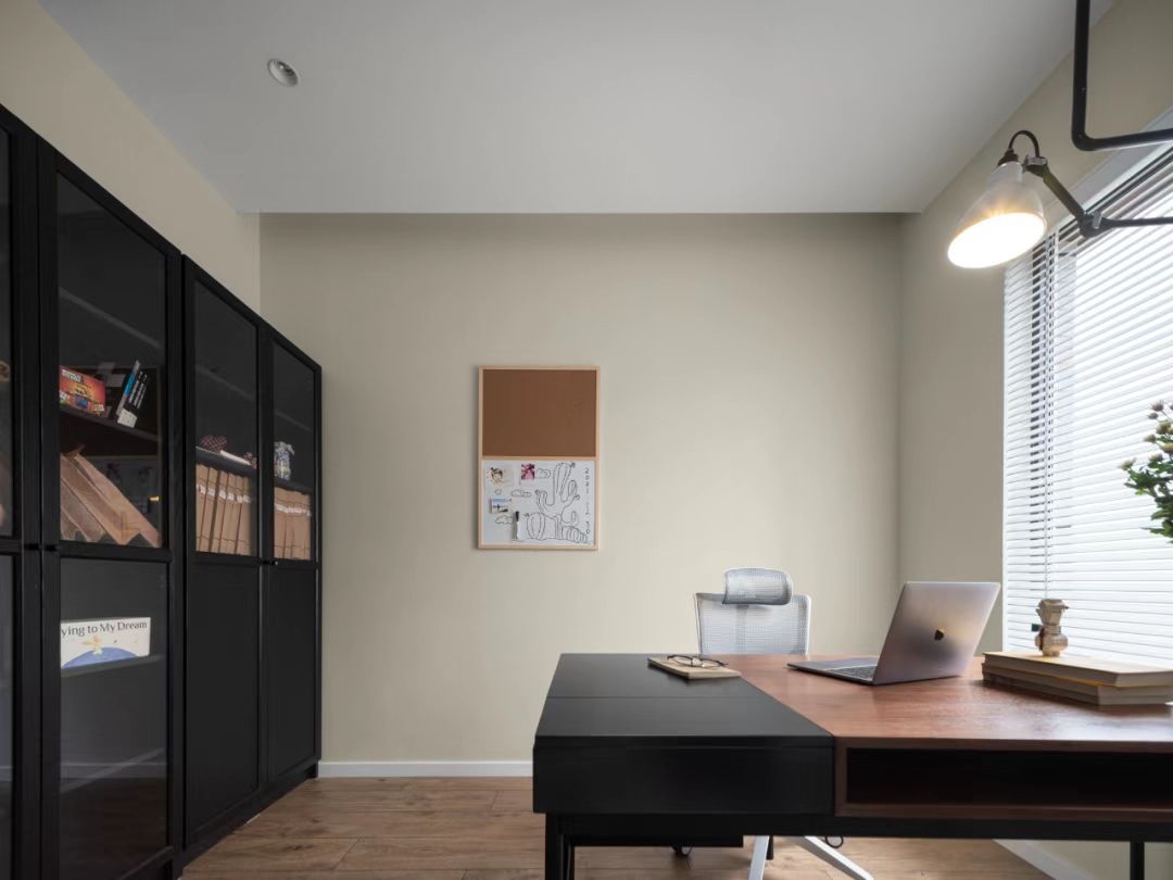 强调学习与办公的一体氛围,沿用外部色彩,添加进木质元素。书房与公共空间之间利用玻璃墙体隔开,为玄关增加光线。