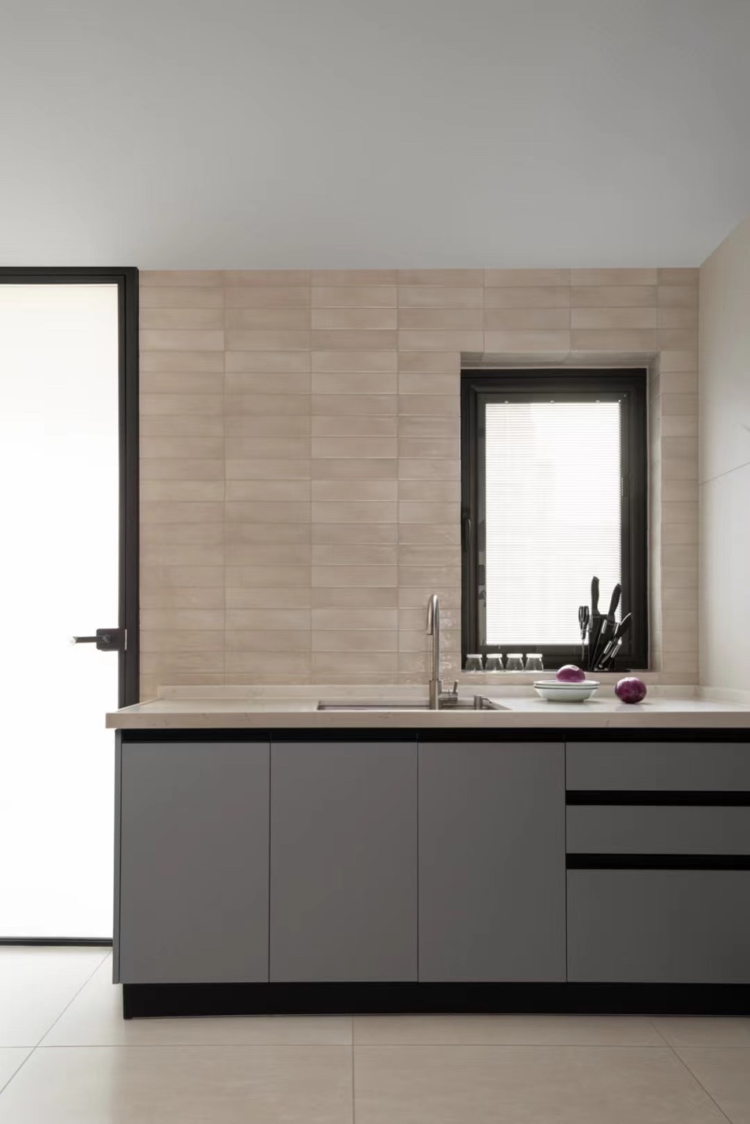 为了让餐厨在视觉上融合但功能上又可独立使用,特意设计了一扇长2850mm的玻璃联动推拉门。