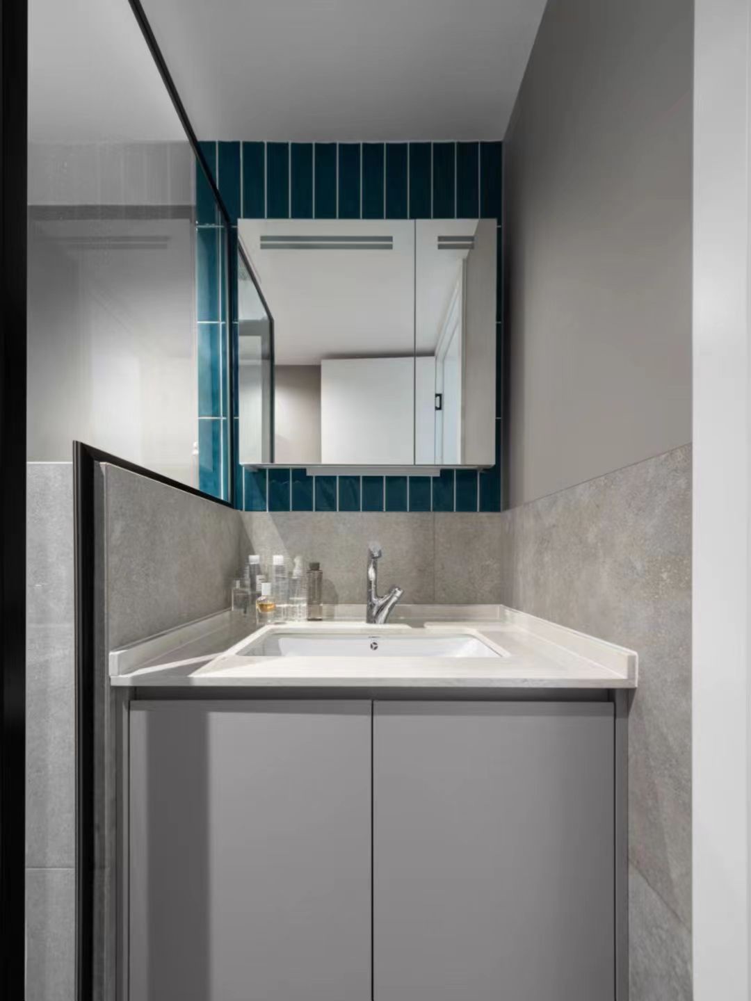 卫生间面积仅3.5m²,在满足基础生活日常的干湿分离的基础上,为墙面融入一半灵动优雅的孔雀蓝。 它成为与自然连接的媒介,让居住者体验到纯粹、愉悦的环境感受。