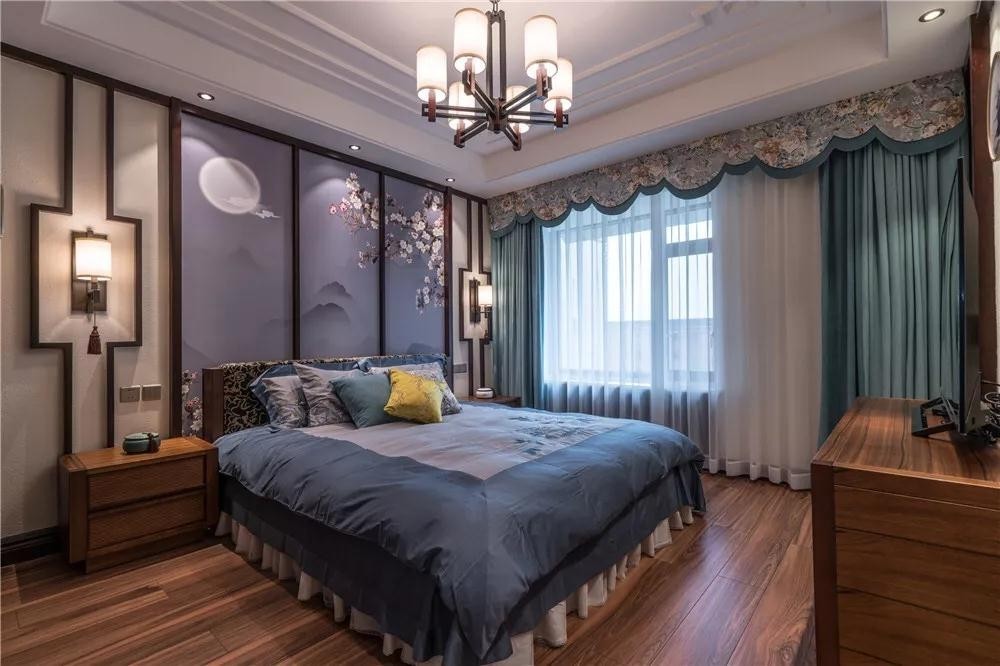 卧室床头墙以带有禅意图案的硬包板,结合舒适的软装布艺,给人以轻松的禅意气息。
