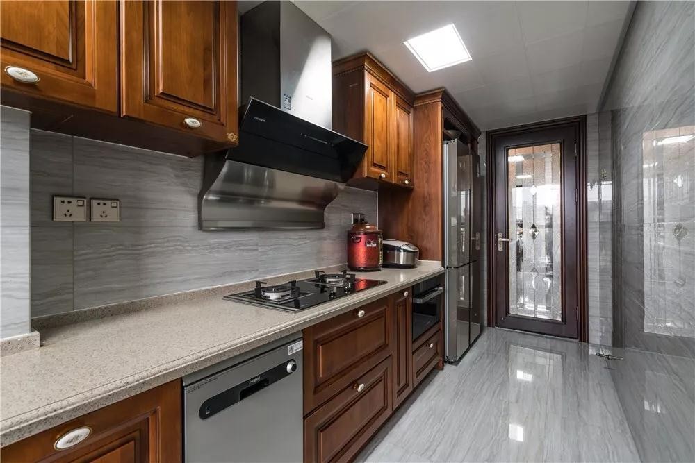 厨房一字形的长条格局,整体以中式木质的定制橱柜吊柜,搭配灰色抛光砖墙面地面,整个空间简约舒适,实用档次。
