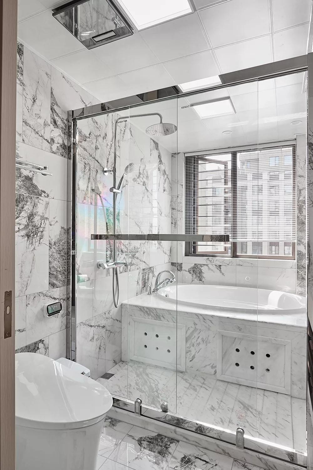 卫生间整体白色泼墨质感的墙面与地面砖,干湿分离的基础在淋浴房里还装了个浴缸,带来更加舒适的淋浴或泡浴享受。