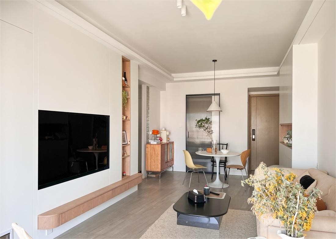 主卧房门的隐形门片设计放大电视背景墙的视觉比例,内嵌电视机和圆弧转角收纳等细节处理让空间过渡更加整体流畅。