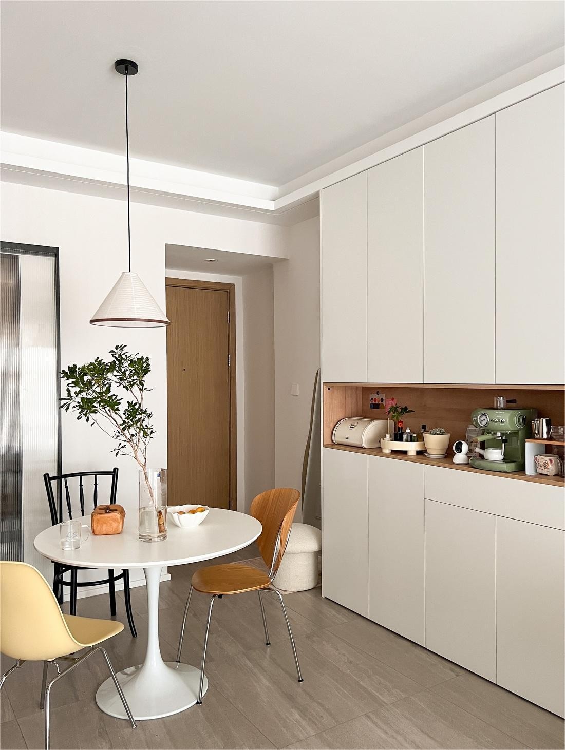 空间大体块采用低饱和度的奶咖色系,小体块如餐椅、厨具、摆件装饰等则用明亮的跳色,整个家立刻就生动活泼起来。