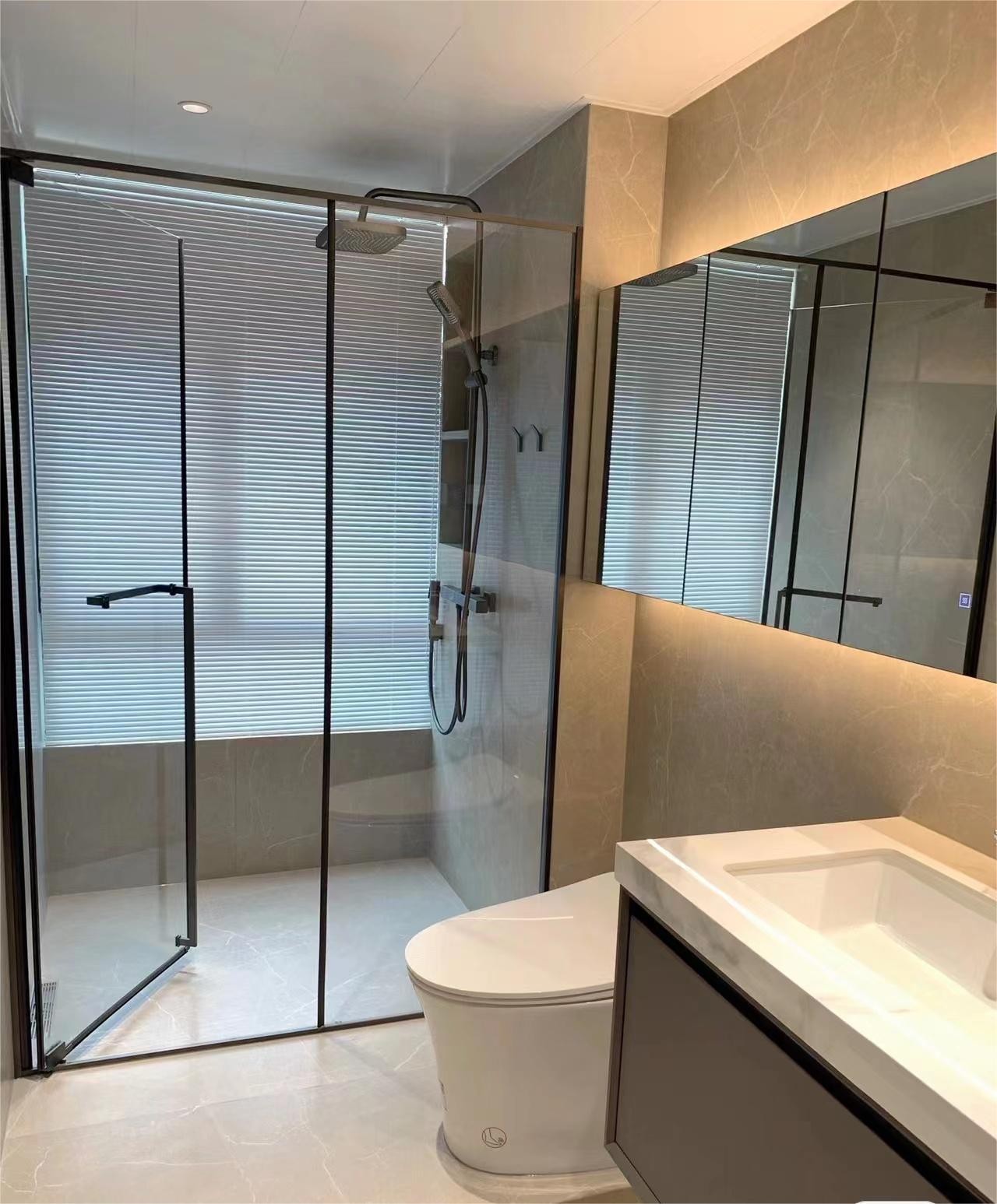 墙地砖用素色搭配深色洁具,极窄玻璃淋浴房拉伸空间感。