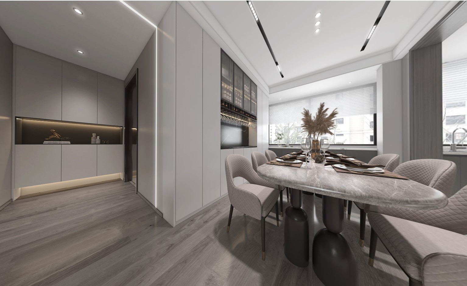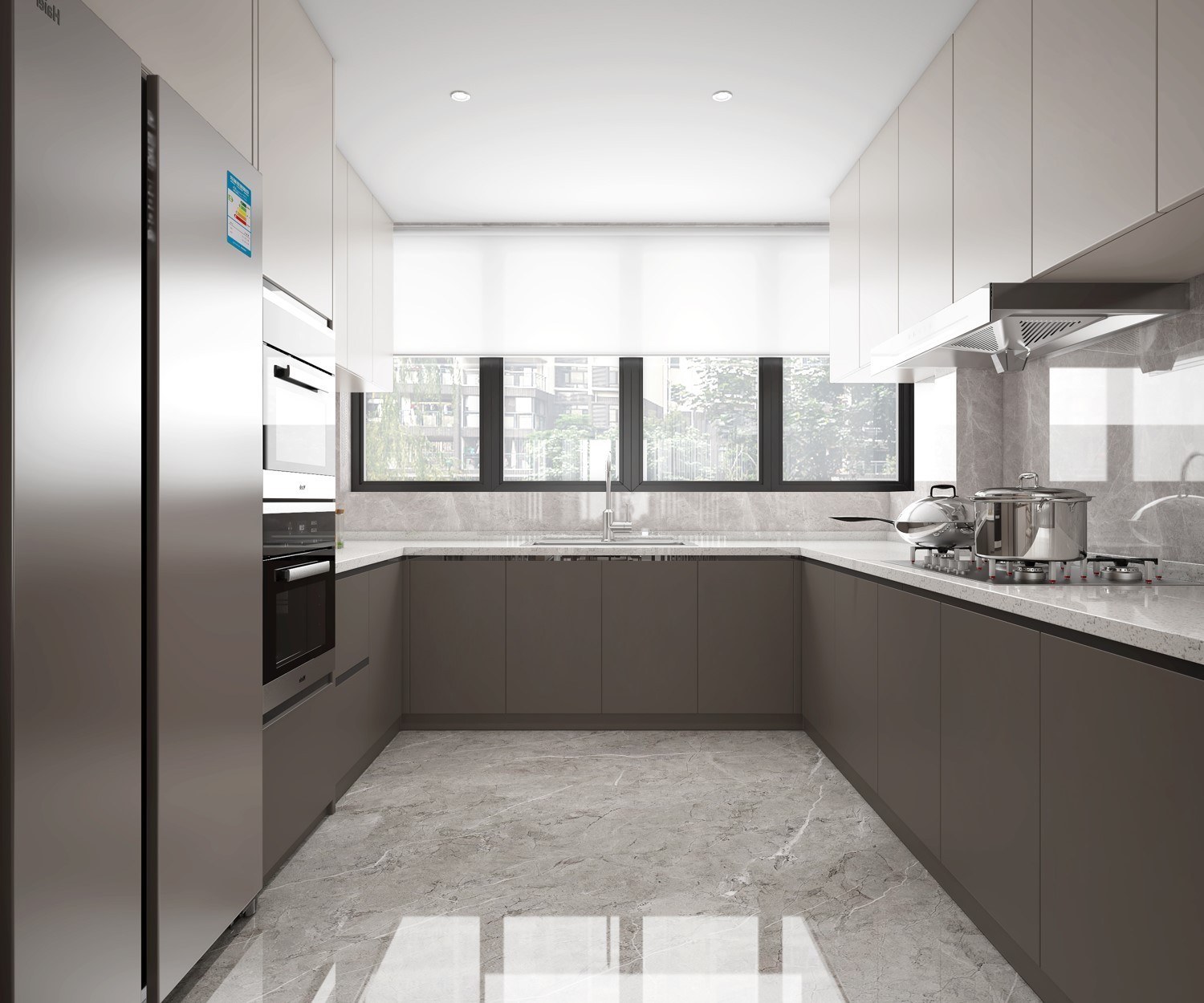 厨房,通过采用地面瓷砖的通铺,增强厨房的空间感,电器立柜的设计,增大储物空间