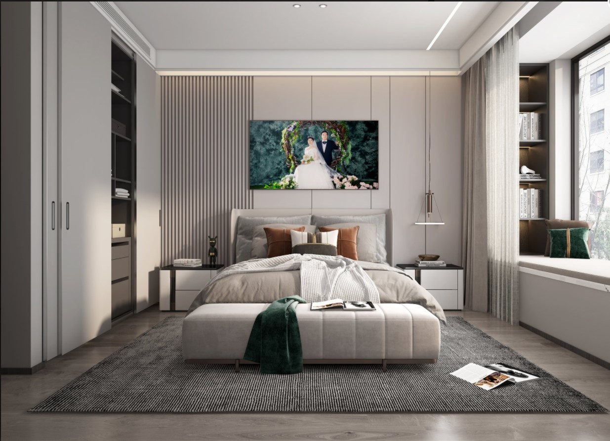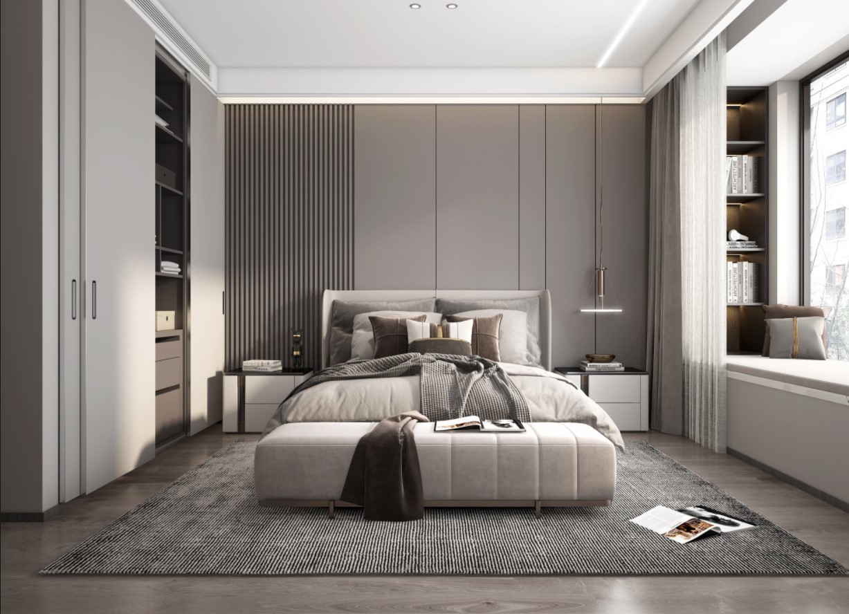 卧室通过温馨的配色以及皮质的床,使得空间营造一种温馨舒适的居室空间