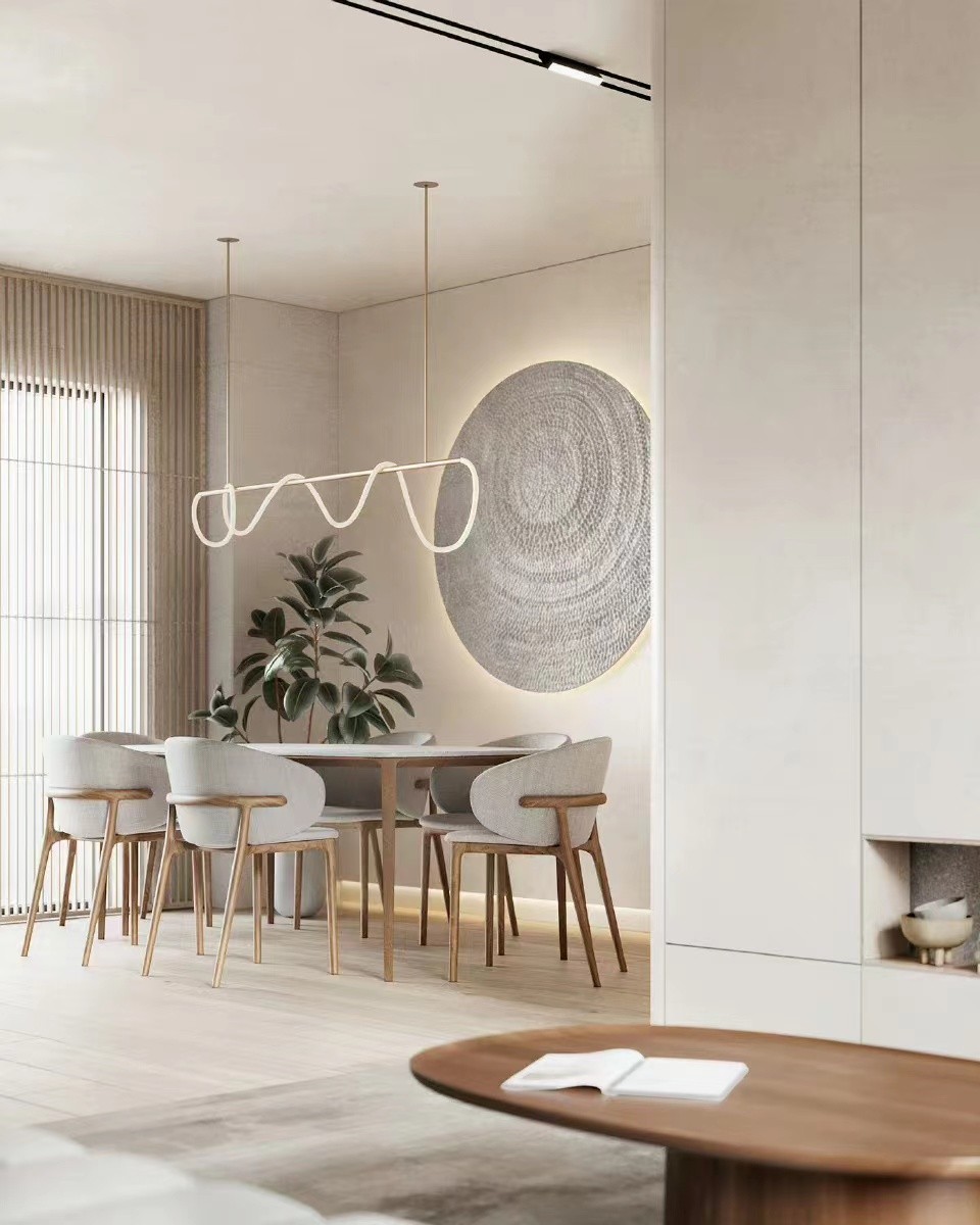 墙面采用侘寂经典米白,空灵而又显纯洁;少而精的装饰搭配简洁而具有设计感;点缀上绿植的清新自然,共同营造出宁静致远的和谐氛围。
