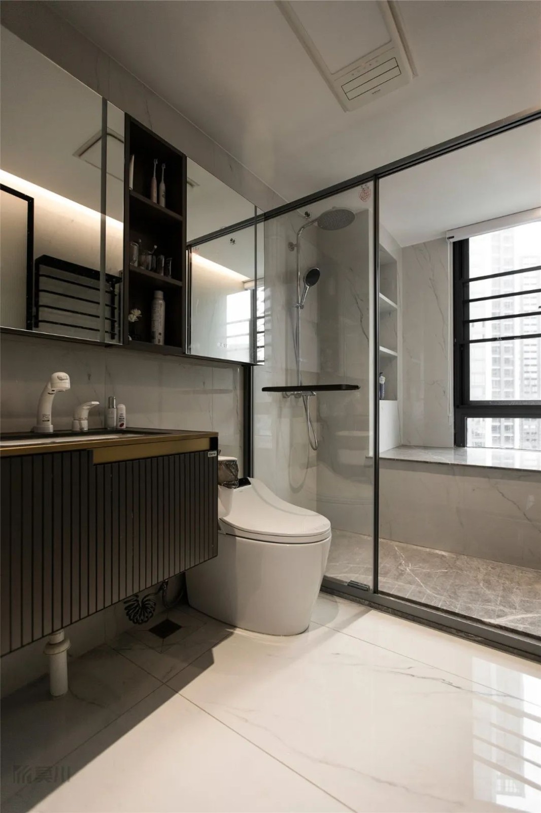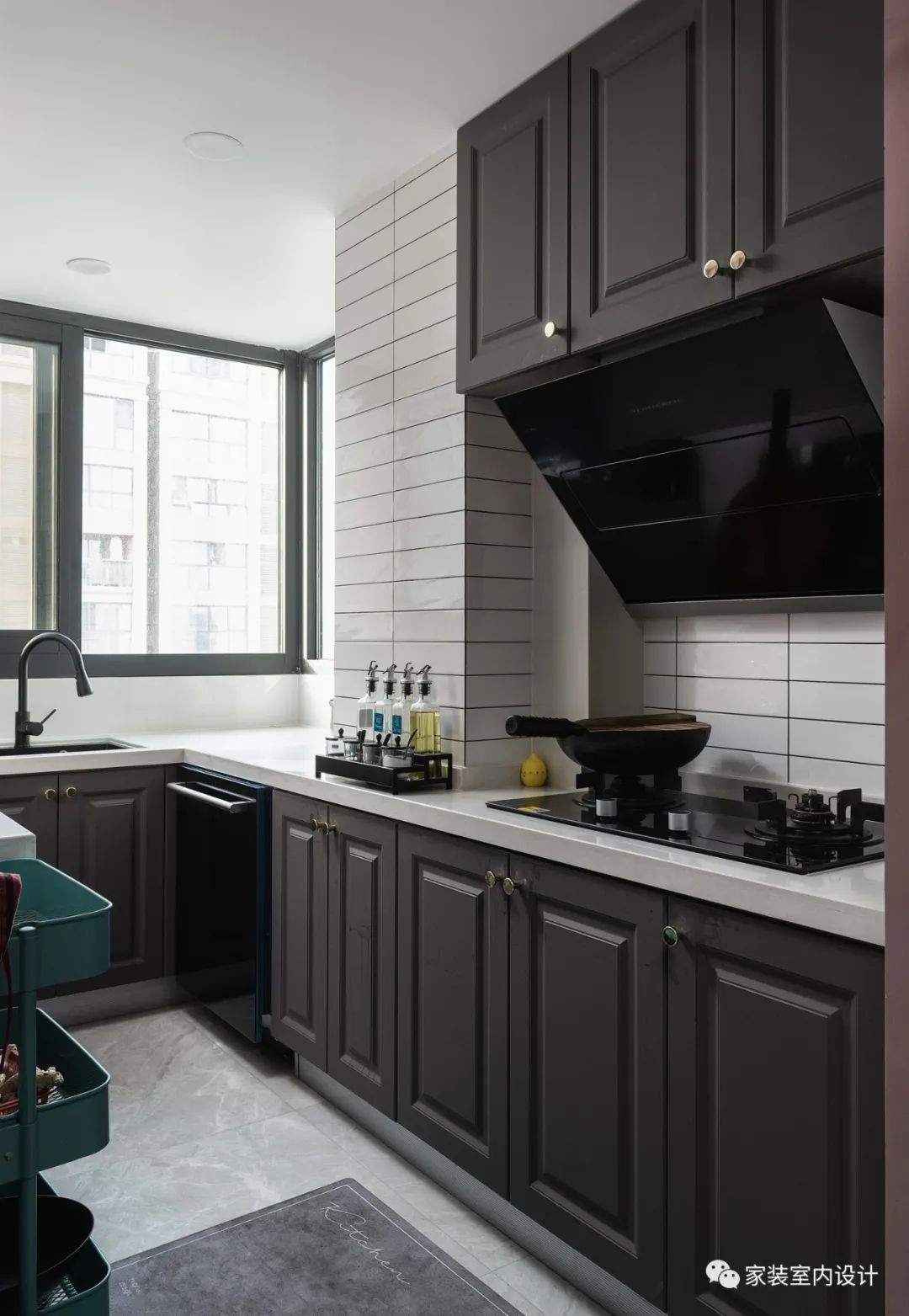 将原本的厨房一分为二,连同北阳台规划成全新的宽敞明亮的厨房,整体素雅的白色搭配百变的灰色,色彩统一而不失变化,透过窗外明亮的采光更延展视觉张力。