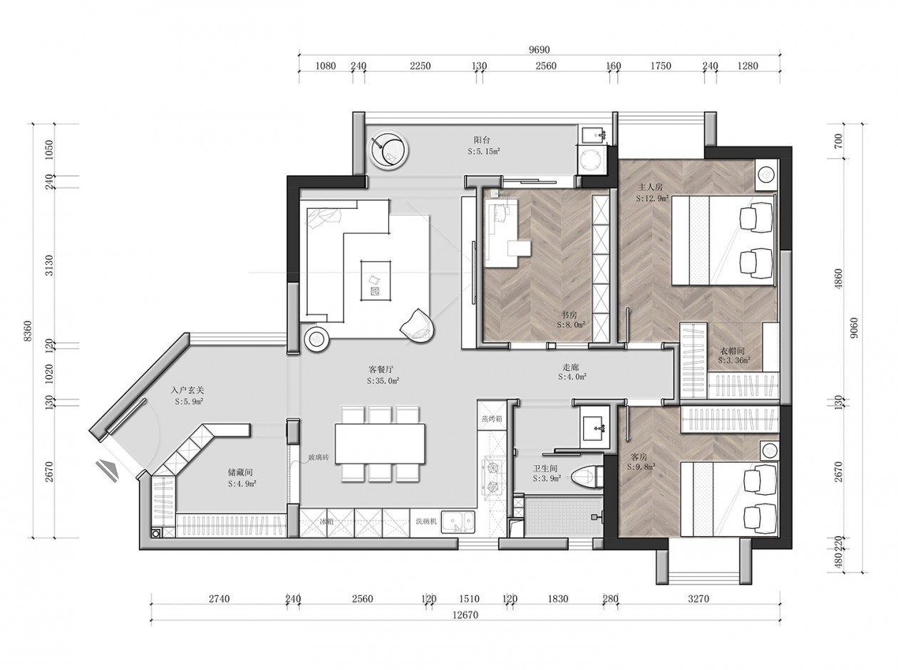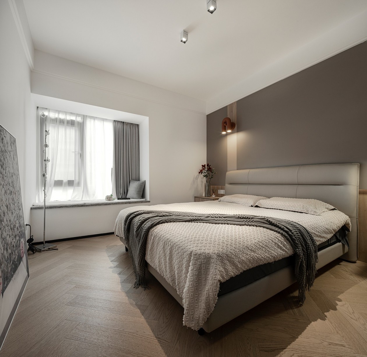 主卧窗台满足到光线可以直接地落入室内,在衣柜区域设置梳妆台供使用,灵巧的灯饰、有生命力的花艺组合在相对低饱和度的底色中显得尤为克制与精彩。