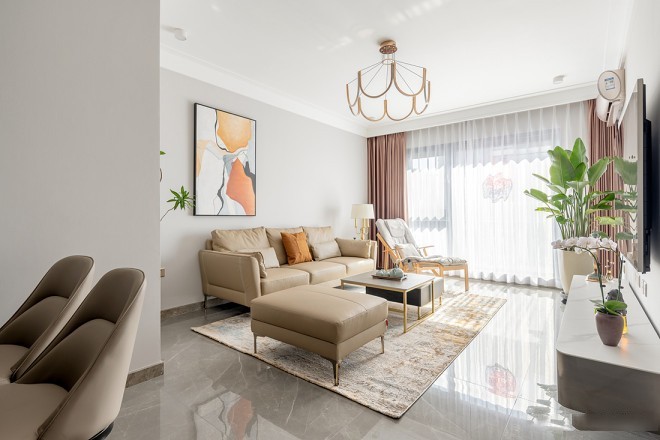 电视墙没有任何多余装饰,一台液晶电视悬挂在墙面上,与沙发之间的距离适中,观看体验。 电视下方是与其等长的极简电视柜,可以收纳不少客厅杂物,保持表面清爽整洁