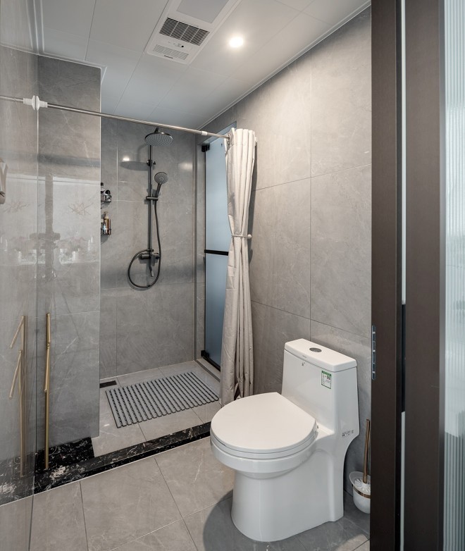 淋浴区域面积不大,直接以米色浴帘代替传统玻璃隔断,方便打理且节约空间。