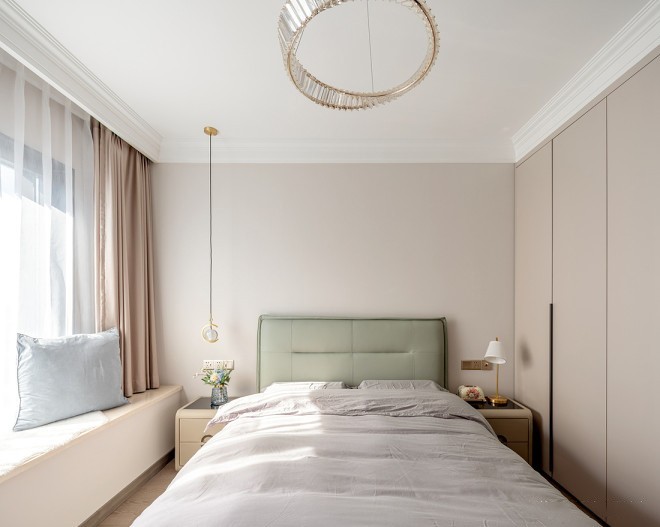 双人床右侧的嵌入式衣柜延续玄关的款式与颜色,与背景墙、窗帘搭配在一起,视觉效果柔和又雅致,营造出沉静、安定的睡眠氛围。 浅绿色的床头靠背,则为素雅的空间带来了不少生机与活力。