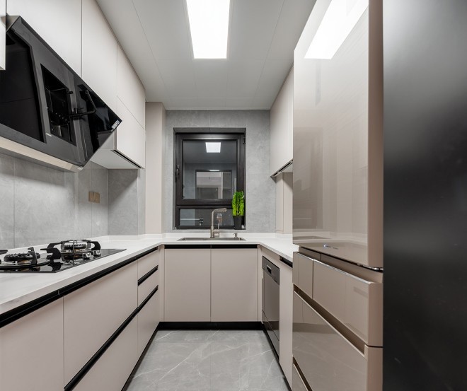 内部面积不大,但U型橱柜的设计让储物空间极其丰富,操作台面也很宽敞,足够容纳两个人同时做饭。