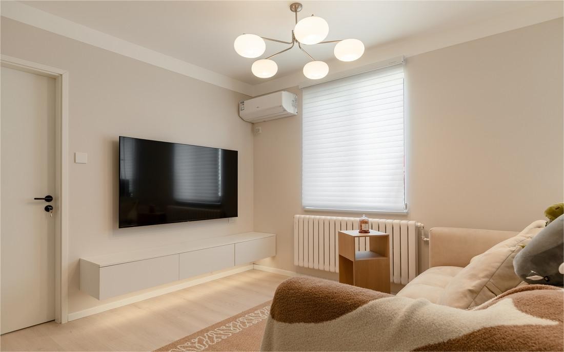 客厅墙、顶面通刷奶油色漆,横铺的燕麦色地板,更换为纵向铺贴的浅木色,空间极尽温柔舒适。圆润可爱的柿子吊灯,取代压抑的吸顶灯,为天花板留足了呼吸感。