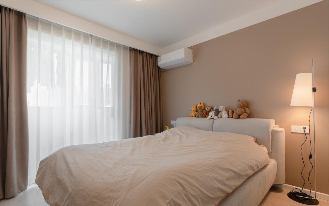 米色软包床松软治愈,牢牢占据卧室C位,加以小地毯和落地灯点缀,入眠氛围静谧舒缓。卧室的床品、窗帘也为脏粉色,与背景墙的调性和谐统一。卧室阳台的移门换成极窄边框的玻璃移门,光线可以***延展入卧室,提升空间的明亮度。