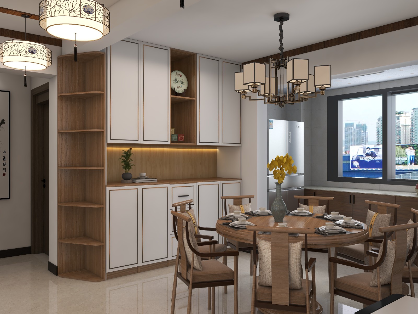 户型分区比较规整,所以餐厅位置安排了酒柜,安排了圆形餐桌。