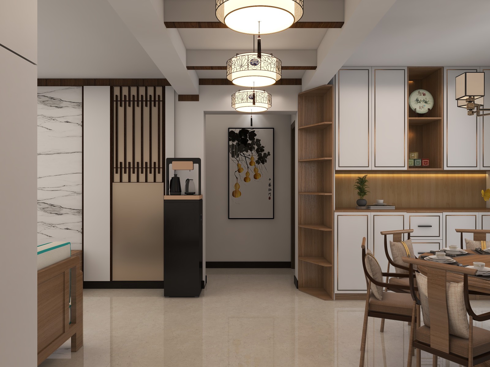 中式风格有很多体现的手法。这套房子业主偏年轻化。整体色调上并没有古乡古语。