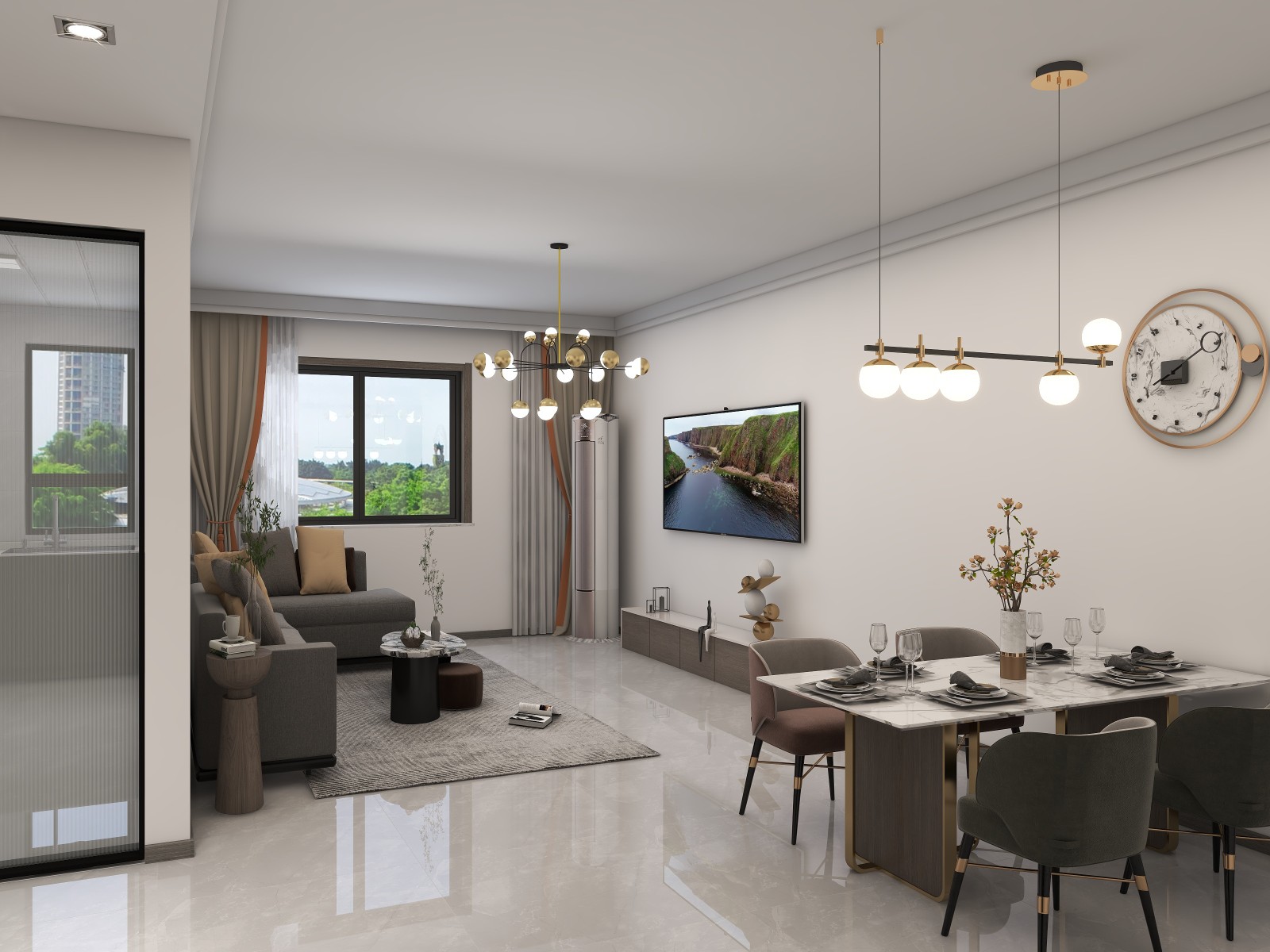 这个户型入户狭长,客厅与餐厅是一体的。