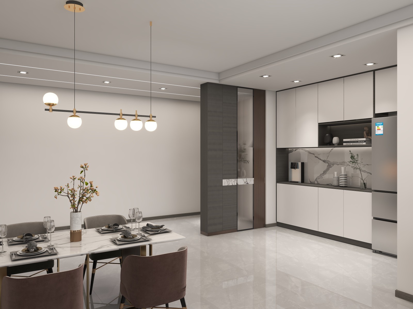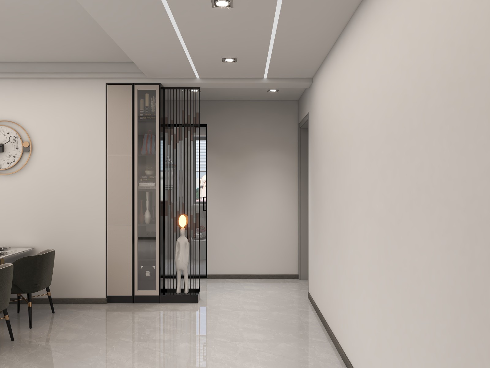 这个入户玄关,不是让大家看顶子,是客户家里,入户门与卫生间门有一半门是对着的。所以稍作改动,在安排一个隔断柜,入户不对卫生间门口了。餐厅也更有氛围感了。