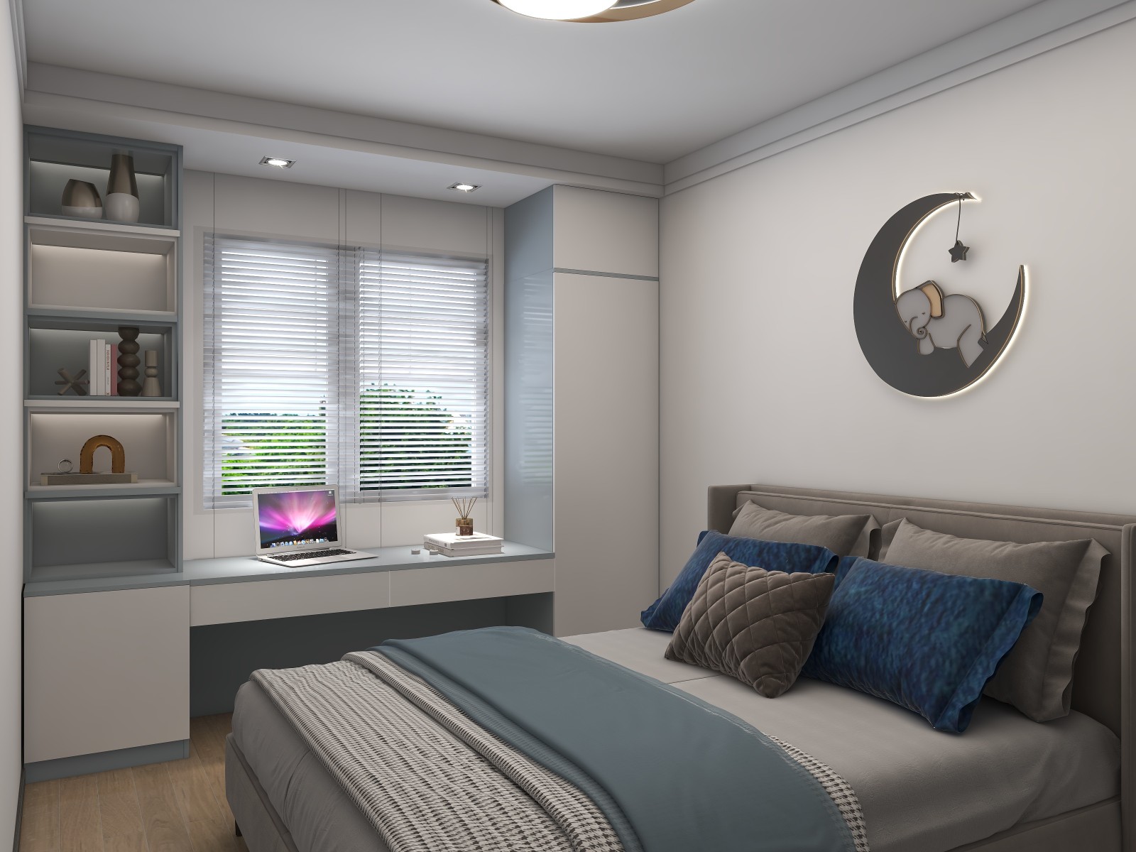 这套是老客户给儿子装的婚房,儿童房考虑到小孩从***到高中,学习书桌与书柜都安排了。希望业主家的***,好好学习,天天向上哈。