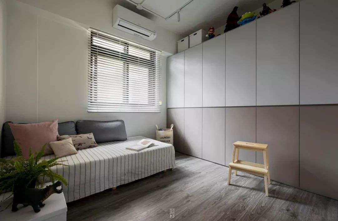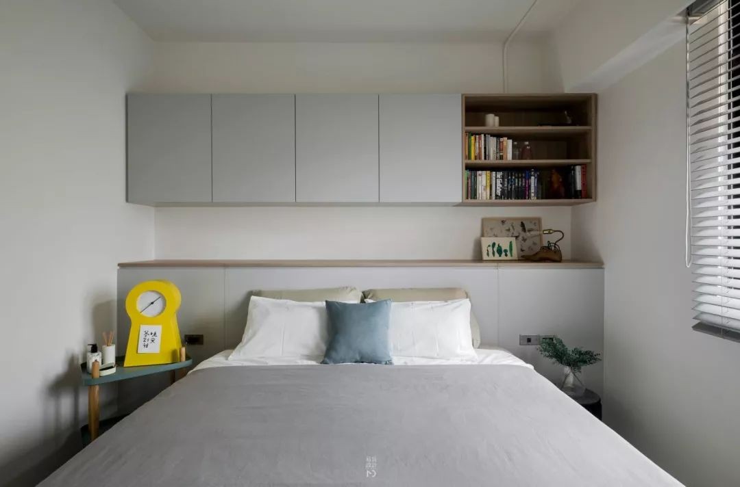 卧室的床头是地柜+吊柜的组合,灰色柜门+灰色床单搭配,整体空间显得现代轻松好舒适。
