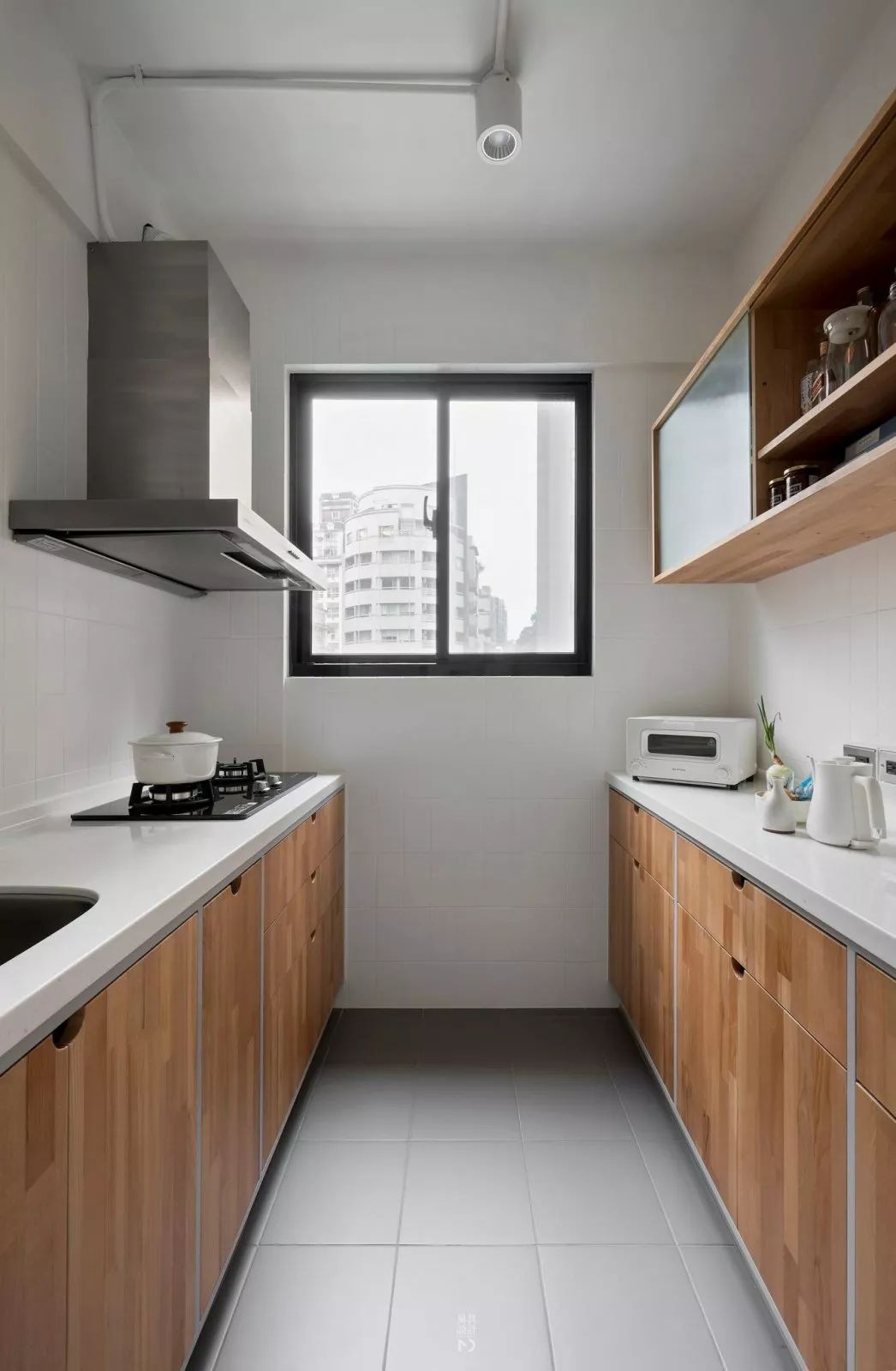 二字型的厨房,在灰色地面+白色墙面砖的结合下,装上木色门的橱柜,小厨房也显得轻松而实用。