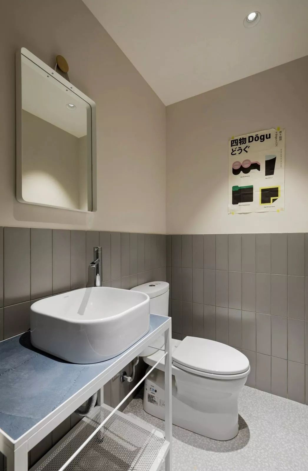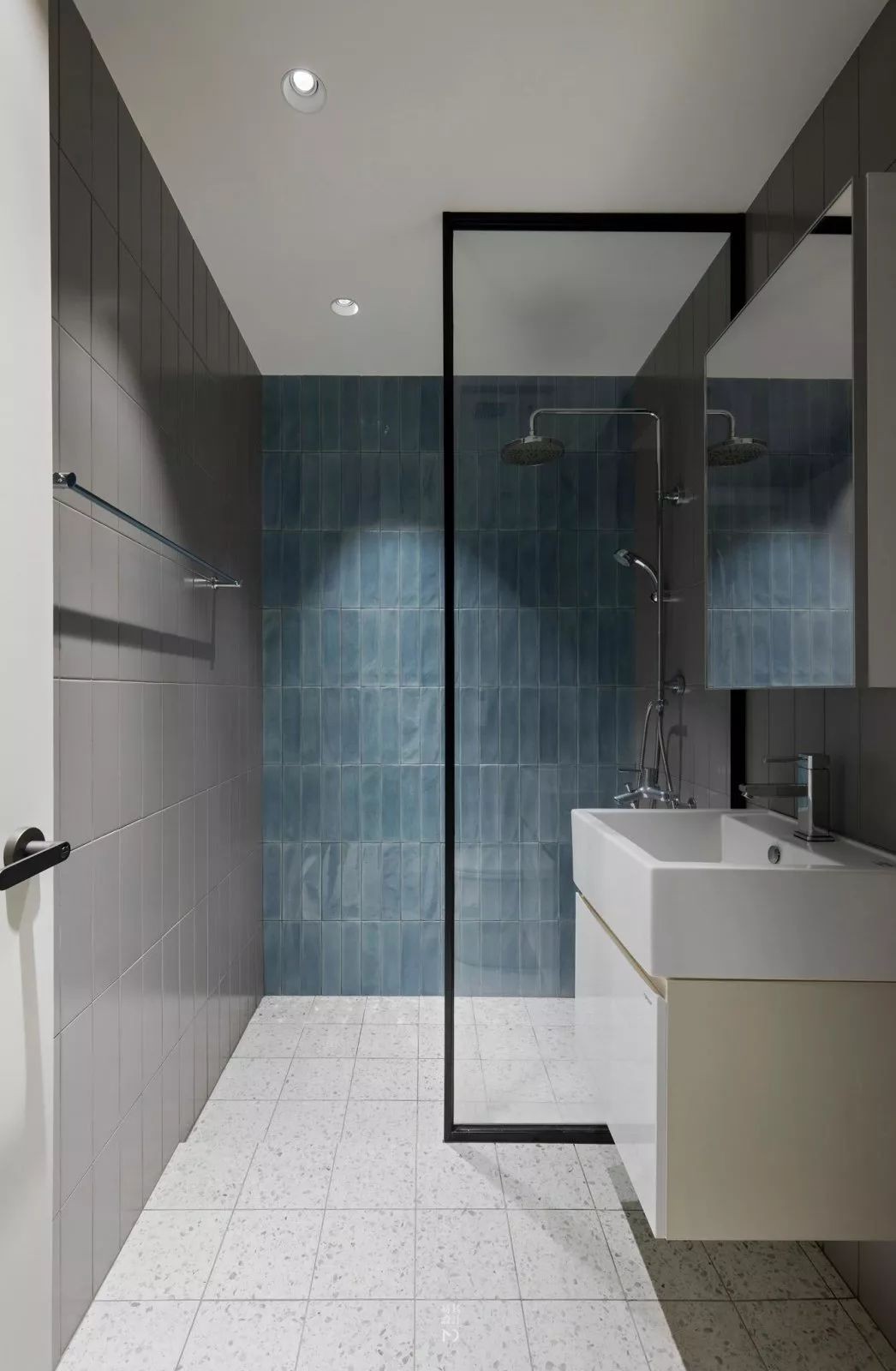 在水磨石地面砖的基础,墙面是灰色+青色的小块砖,淋浴房与洗手盆中间装了一块的黑框玻璃隔断,整体空间设计更加文艺时尚。