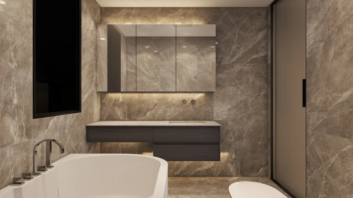 悬空浴室柜,温馨灯光衬托出卫生间的温馨实用