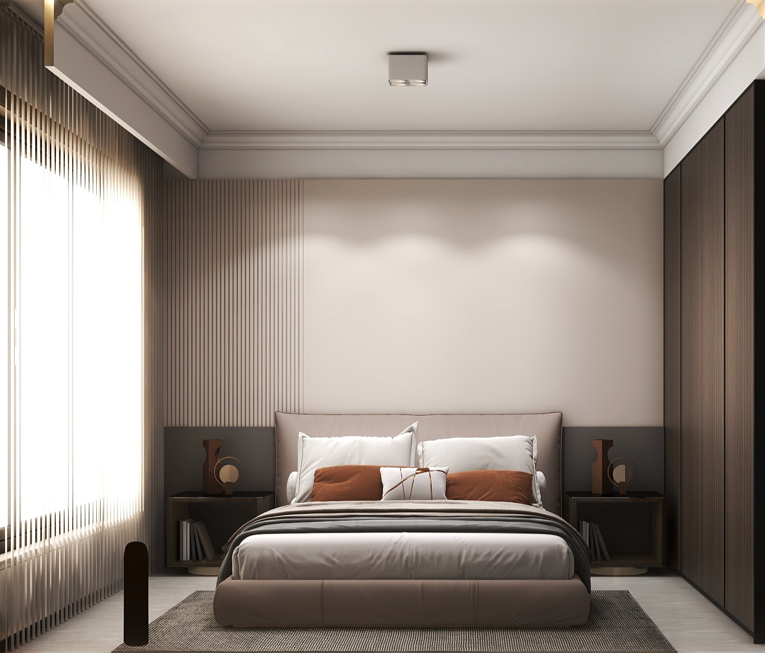 主卧背景墙格栅搭配饰面板,下方氛围灯起夜不在干扰对方。